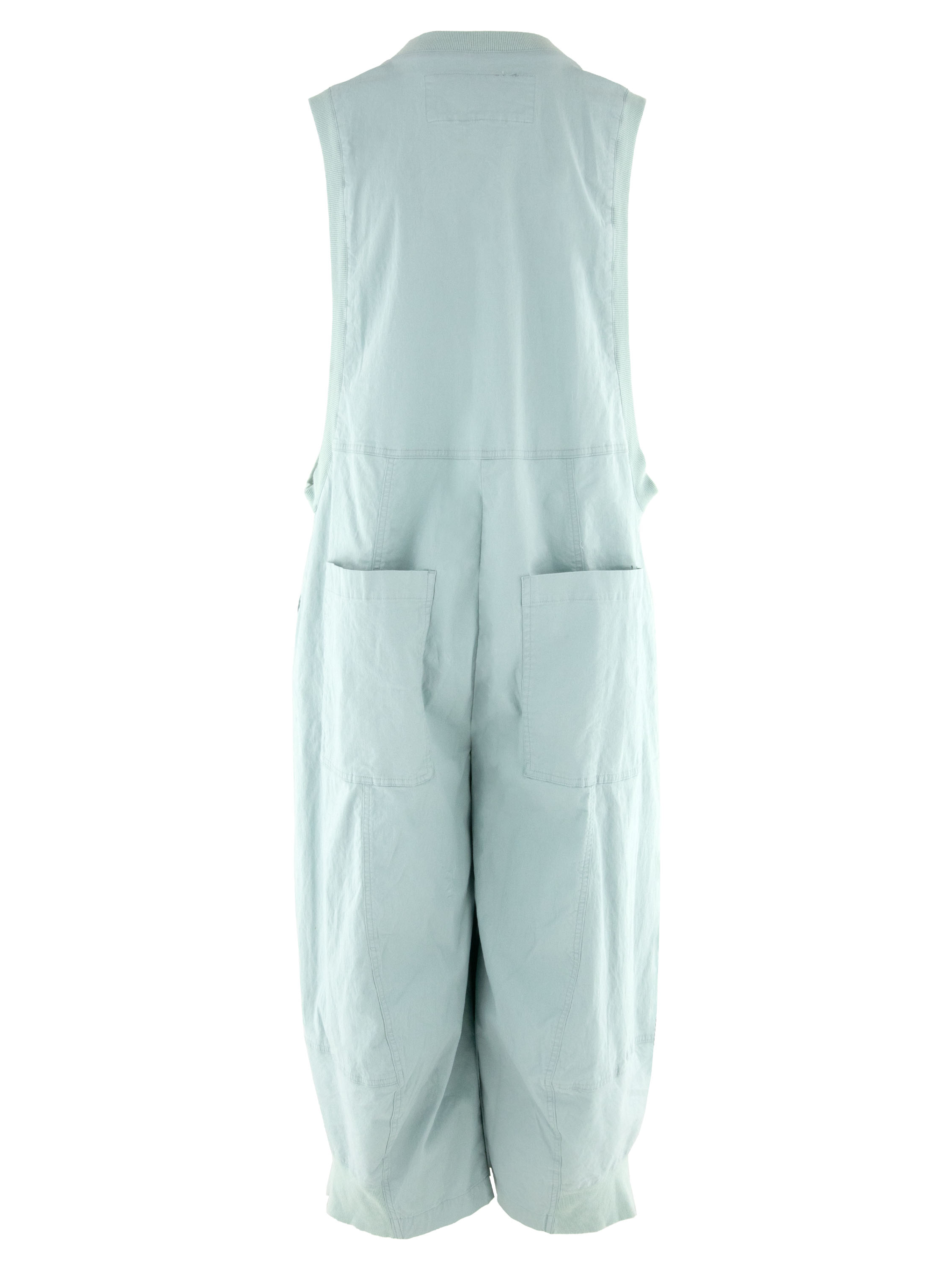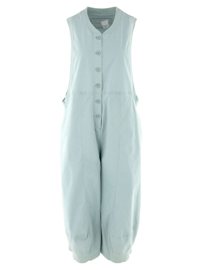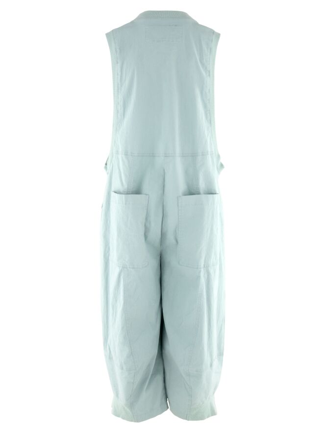 Jumpsuit van Rundholz Black Label in een frisse mintgroene tint. Langs de rand van de hals en de mouwinzet is een fijn geribbelde tricot boord verwerkt, wat zorgt voor een subtiel sportief accent. Vanuit de hals loopt een knoopsluiting tot onder de taille. Ter hoogte van de taille zijn ruime steekzakken aangebracht. De pijpen lopen naar de onderzijde licht taps toe, wat het silhouet een moderne en ontspannen uitstraling geeft.