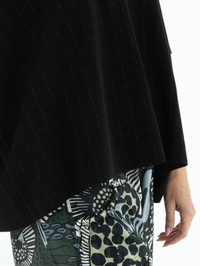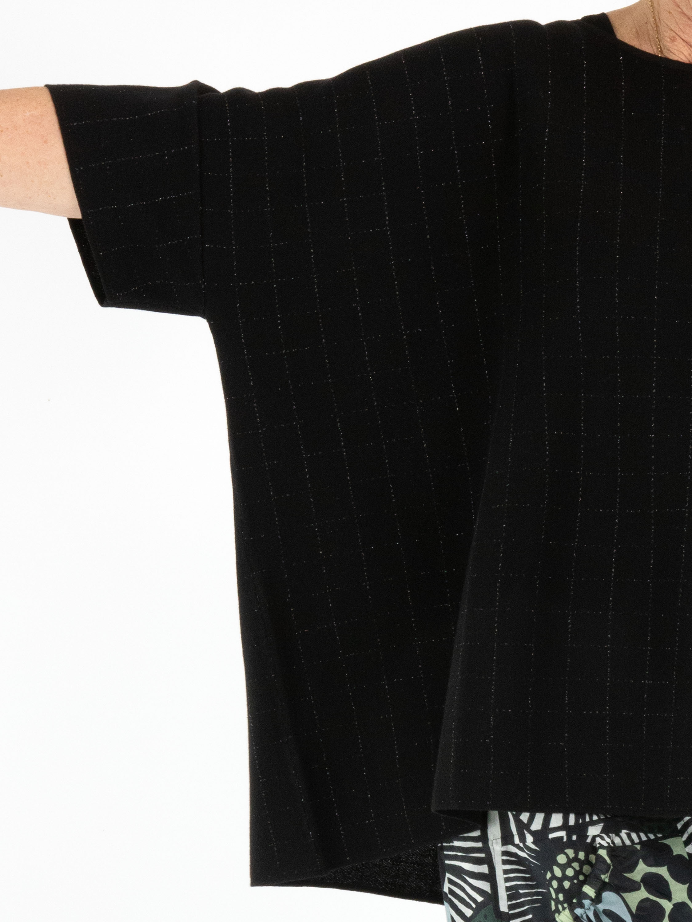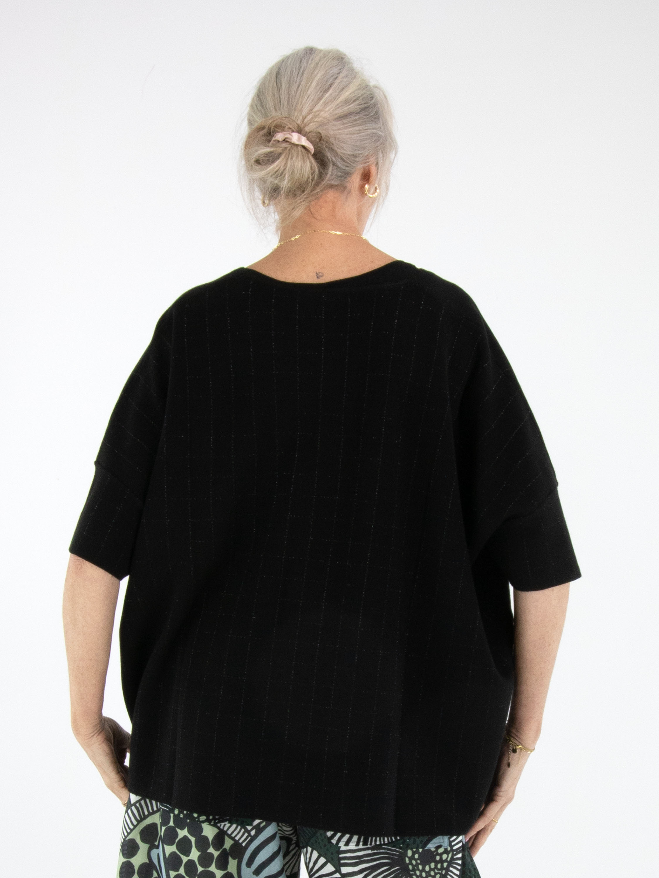Wijde pullover van Rundholz Black Label in de kleur zwart. In de stof is een subtiel blokpatroon met zilverdraad geweven, wat zorgt voor een verfijnde glans en een eigentijdse uitstraling. De pullover heeft korte mouwen en een ronde hals. Deze exclusieve designer pullover kan op 30 graden worden gewassen.