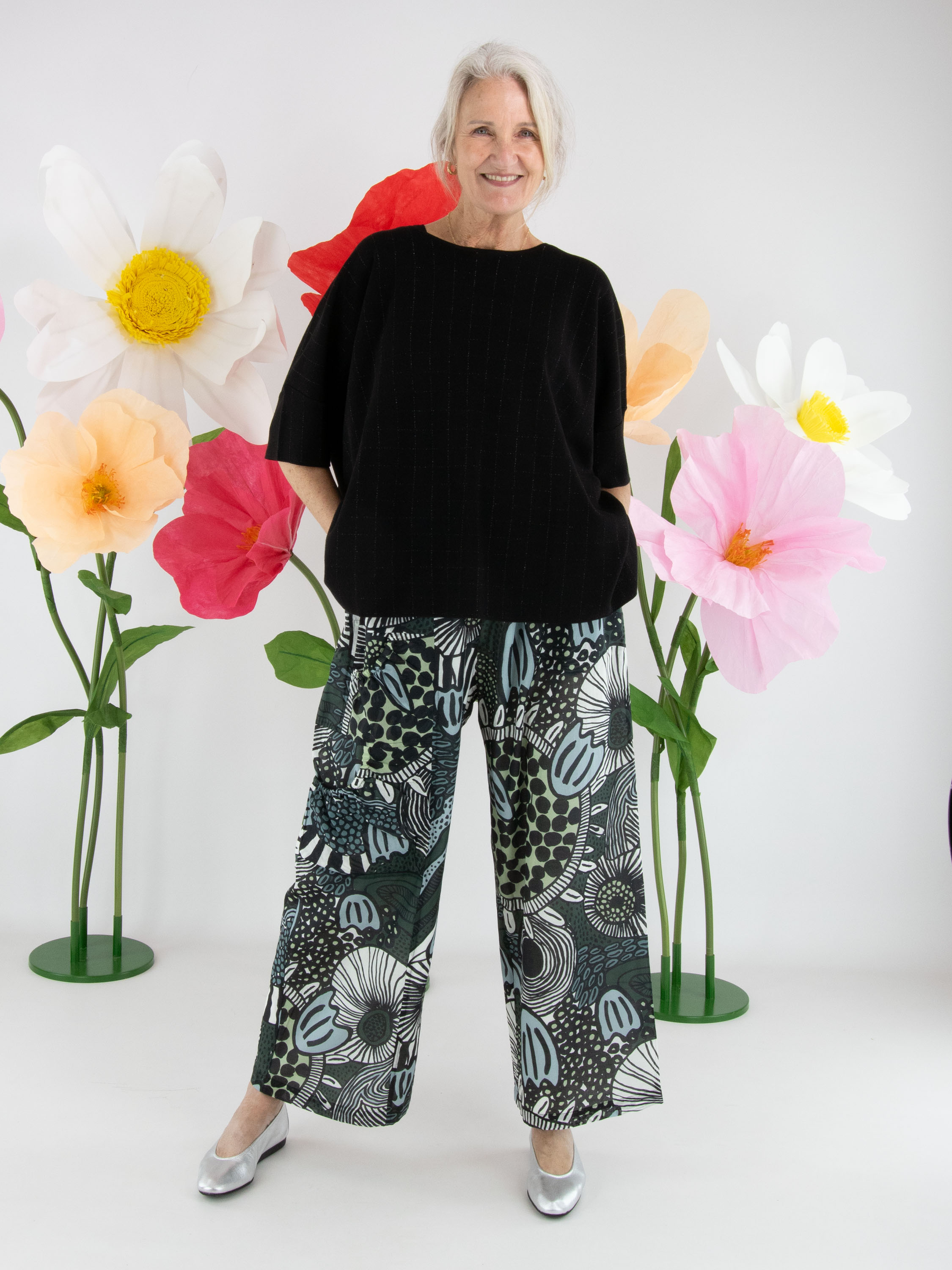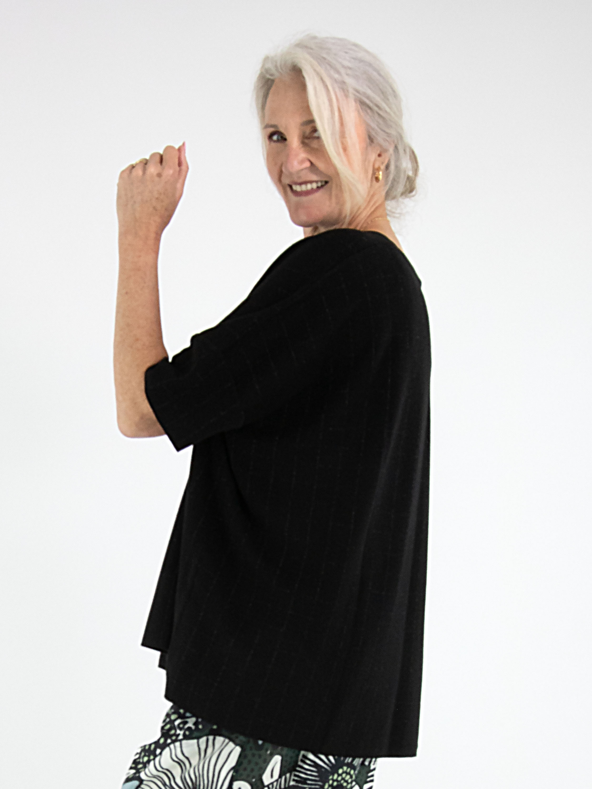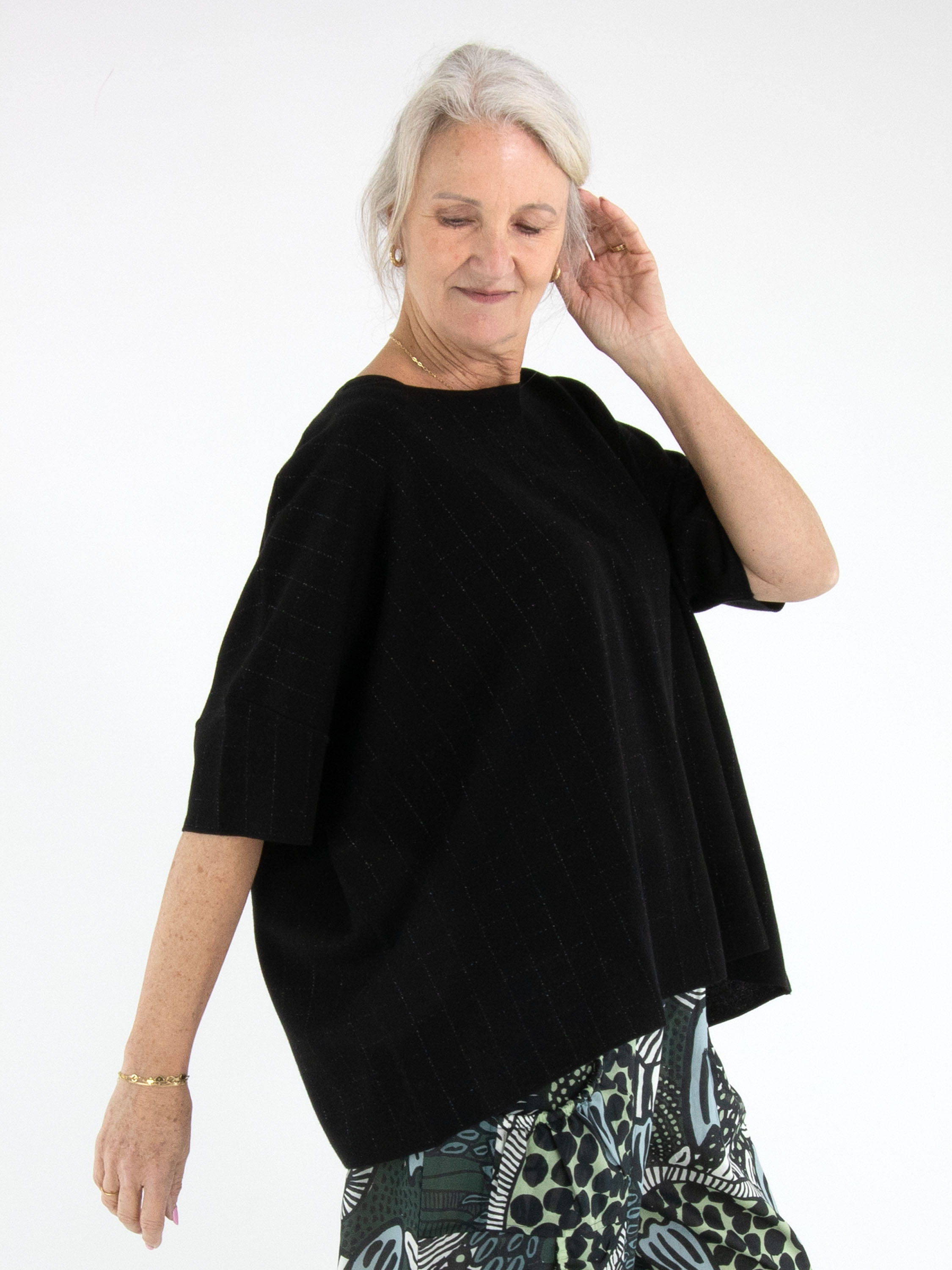 Wijde pullover van Rundholz Black Label in de kleur zwart. In de stof is een subtiel blokpatroon met zilverdraad geweven, wat zorgt voor een verfijnde glans en een eigentijdse uitstraling. De pullover heeft korte mouwen en een ronde hals. Deze exclusieve designer pullover kan op 30 graden worden gewassen.