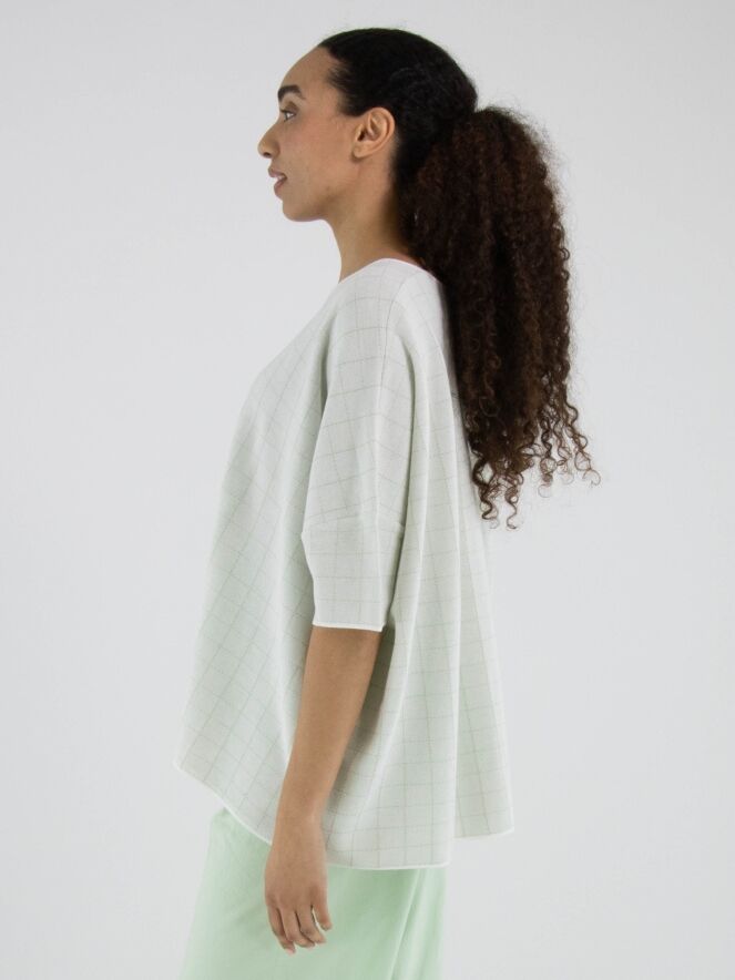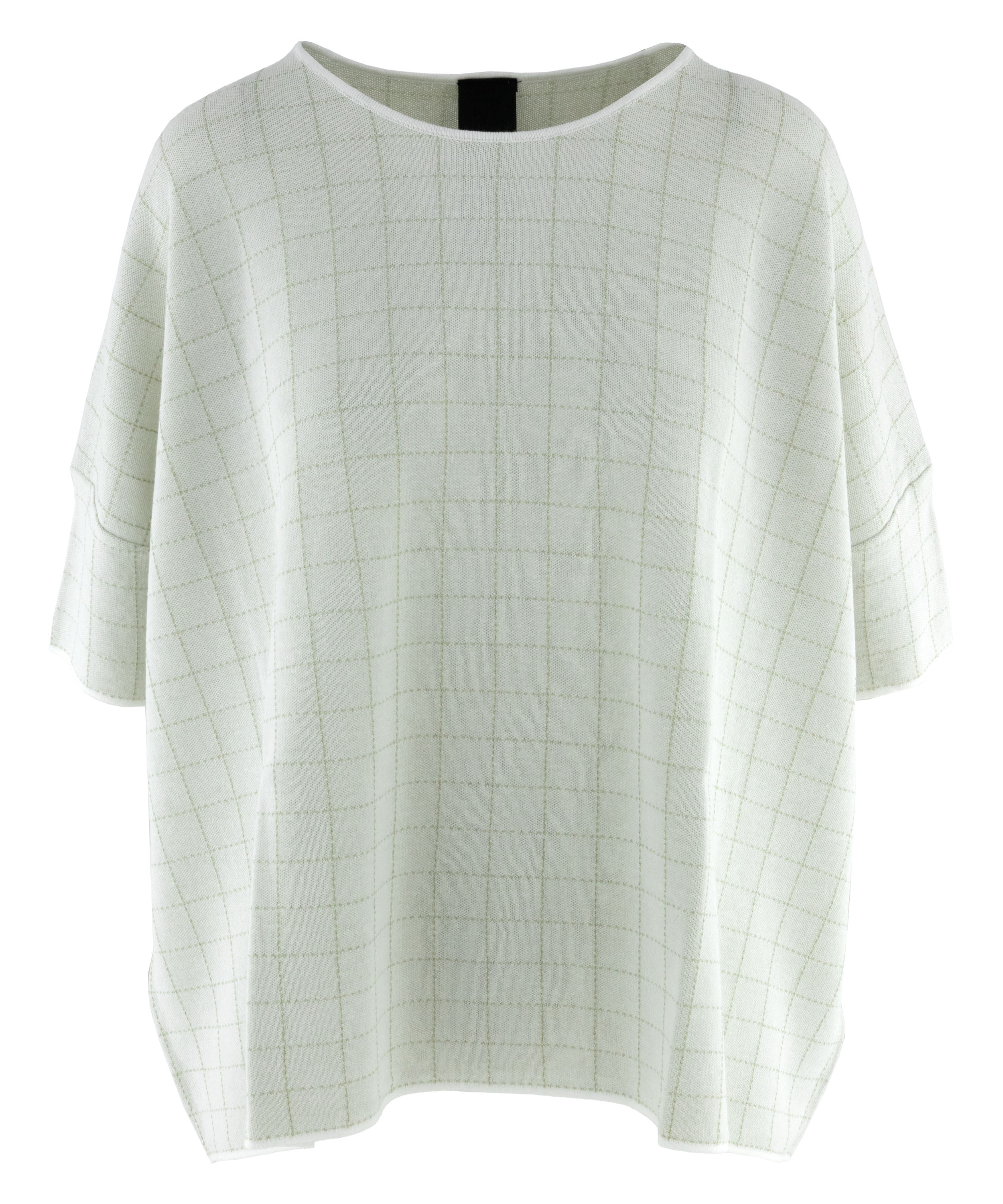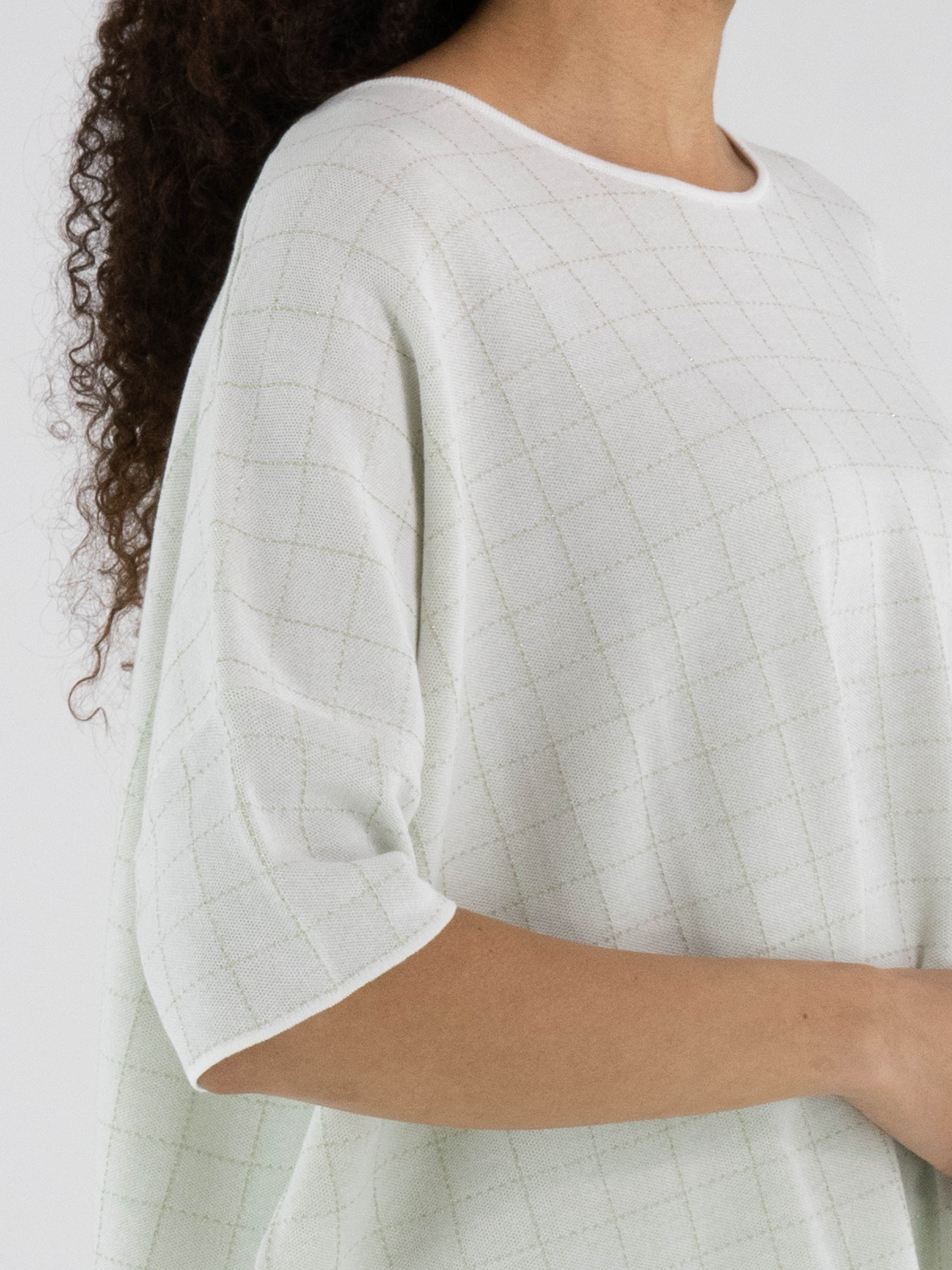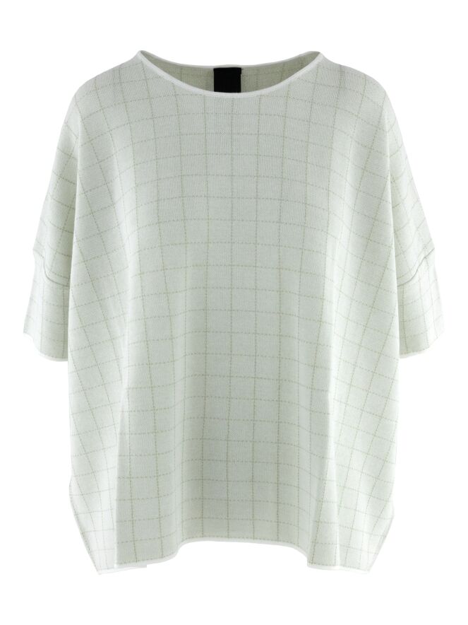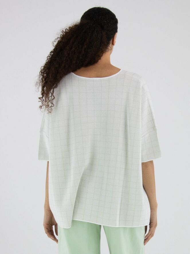 Wijde pullover van Rundholz Black Label in een elegante roomwitte tint. In de stof is een subtiel blokpatroon met gouddraad geweven, wat zorgt voor een verfijnde glans en een luxueus accent. De pullover heeft korte mouwen en een ronde hals. Dit exclusieve designeritem kan op 30 graden worden gewassen.
