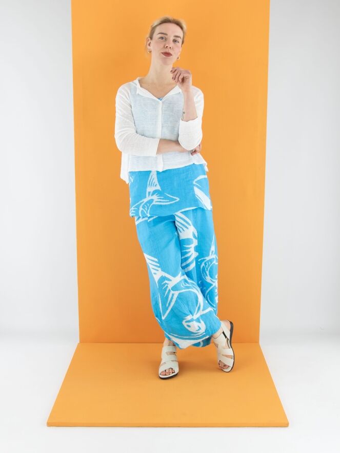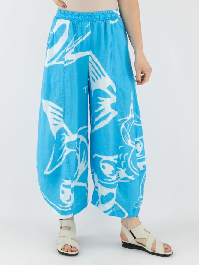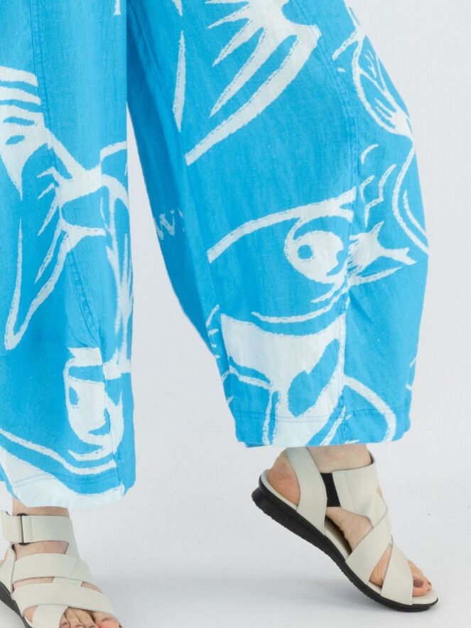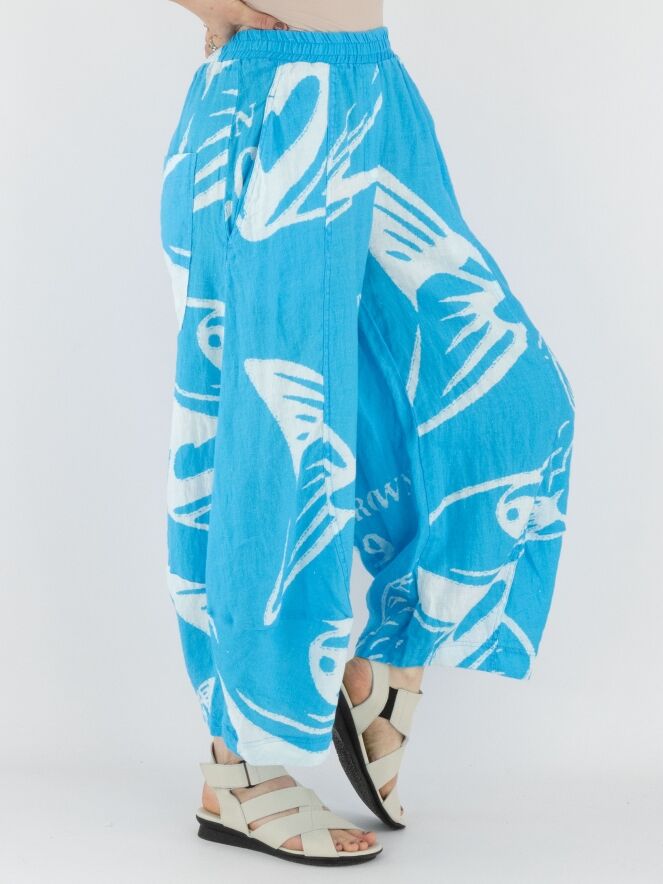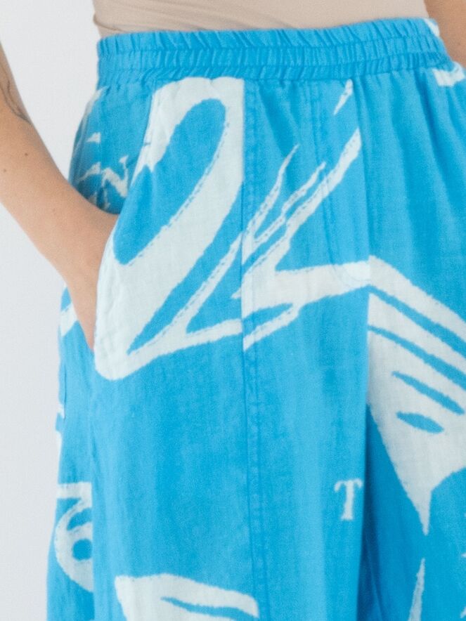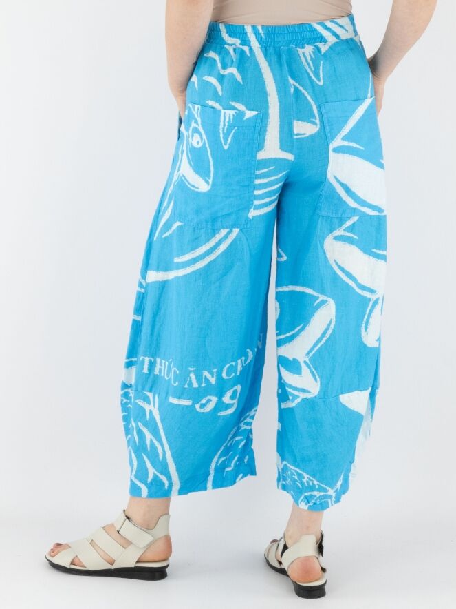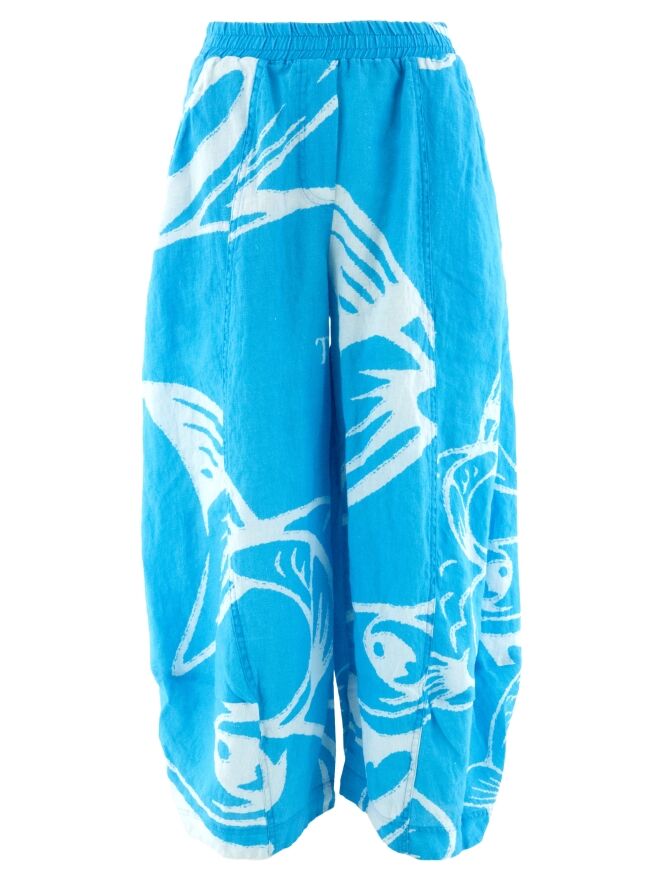 Een wijde broek van Rundholz Black Label met een print van vissen en letters in de kleuren helderblauw en wit. De taille heeft een fijn geplooide elastische band. Aan de onderkant loopt de broek iets taps toe, wat een balloneffect creëert. De broek heeft steekzakken en mag op 30 graden worden gewassen.