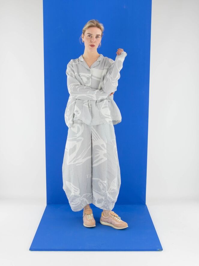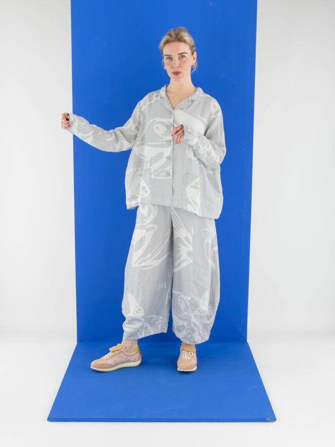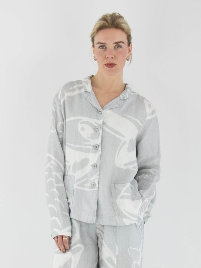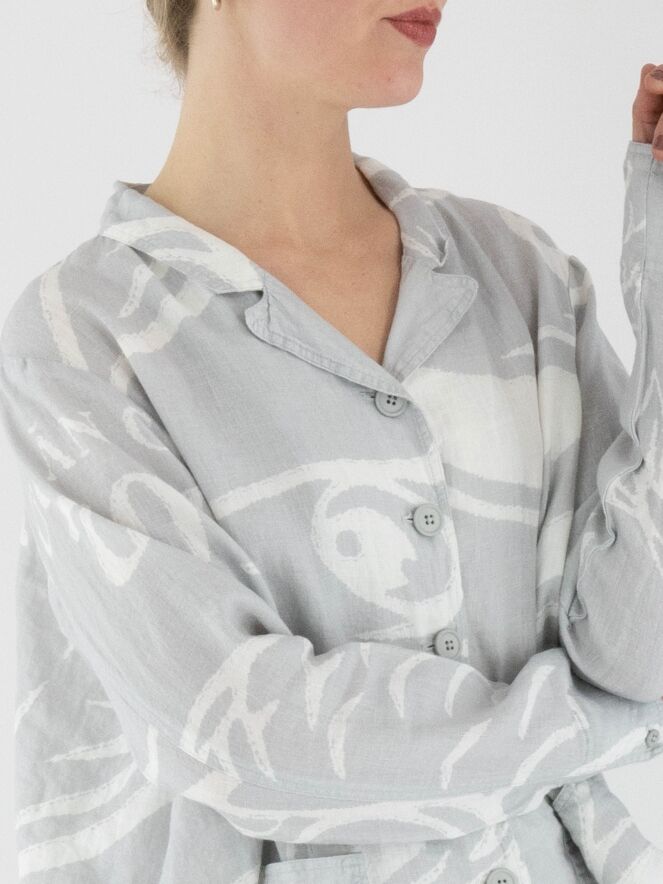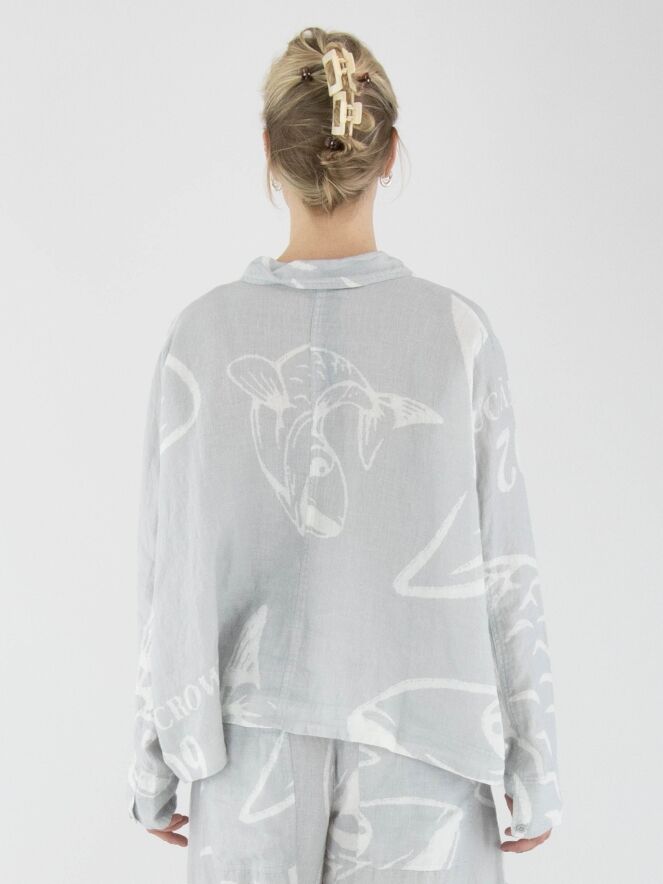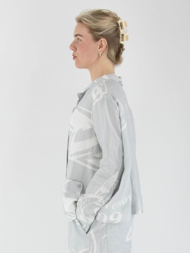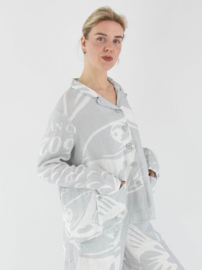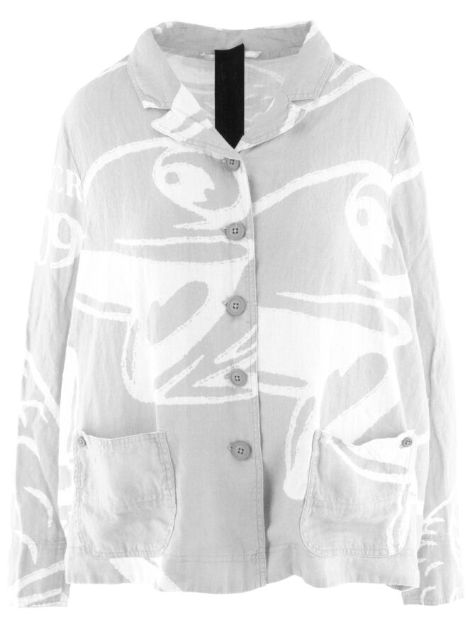 Een wijde blazer van Rundholz Black Label met een print van vissen en letters in de kleuren lichtgrijs en wit. De blazer heeft een sluiting met vijf knopen en is ongevoerd. Aan de voorkant zitten zakken met een decoratief knoopje aan de buitenzijde. Deze blazer mag op 30 graden worden gewassen.
