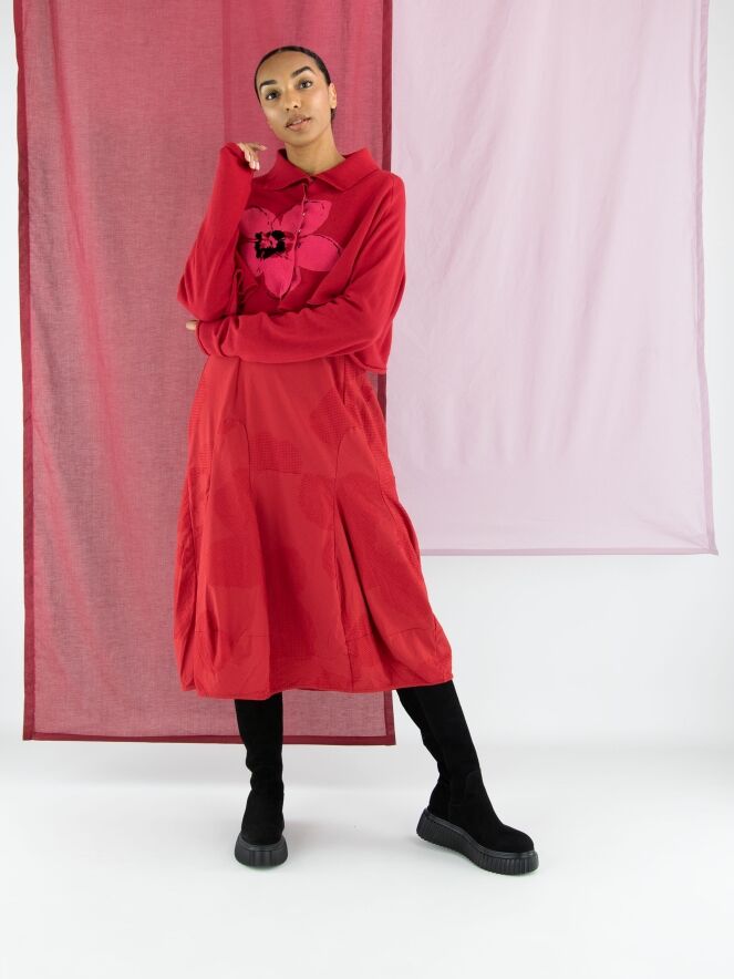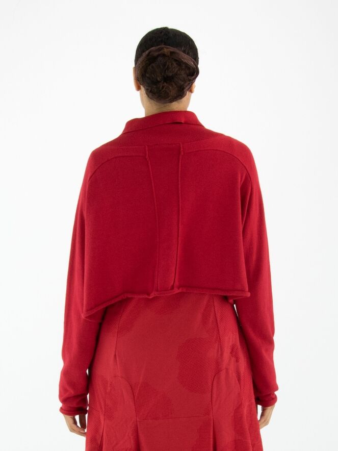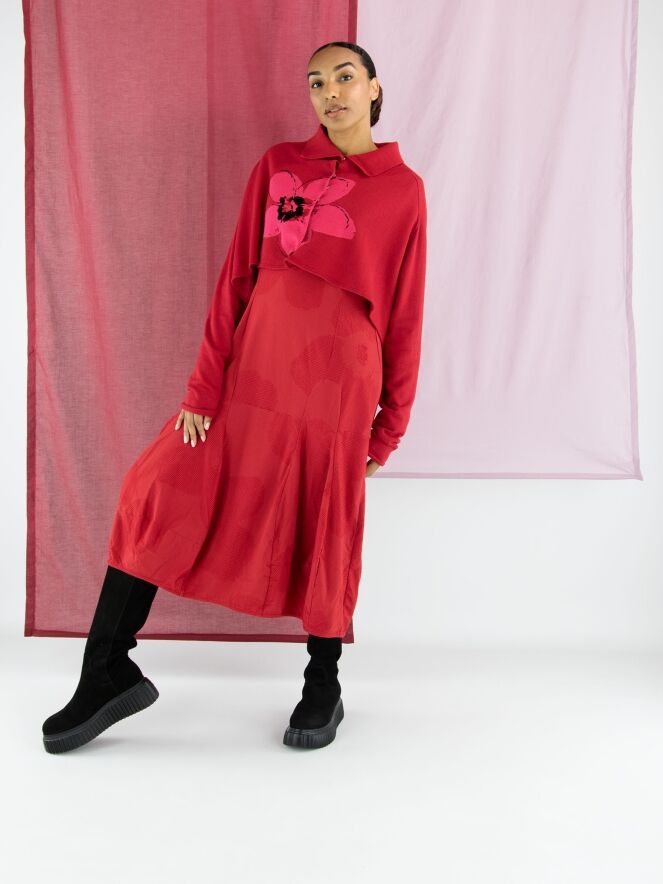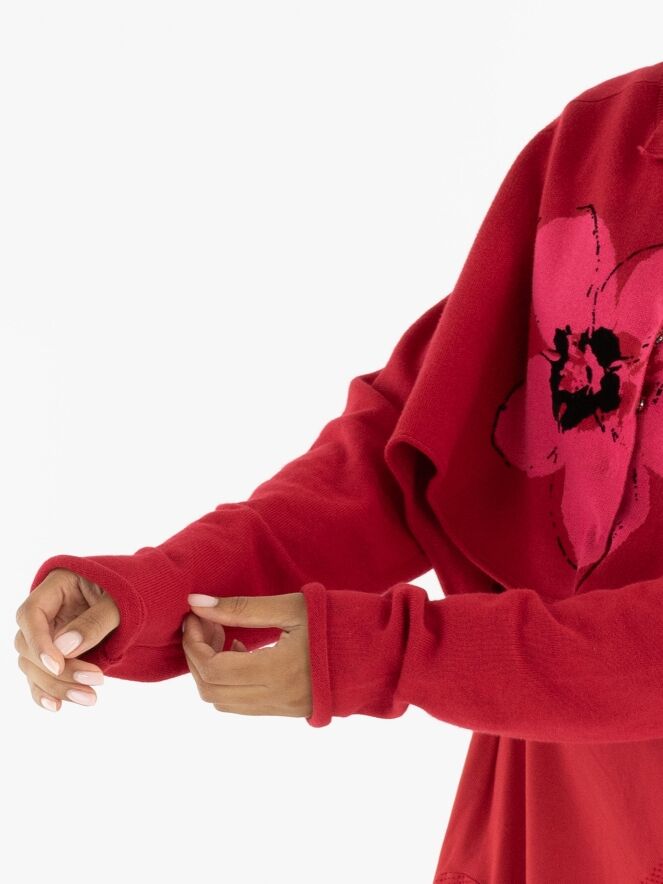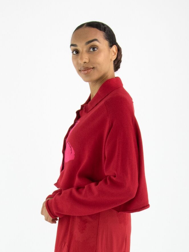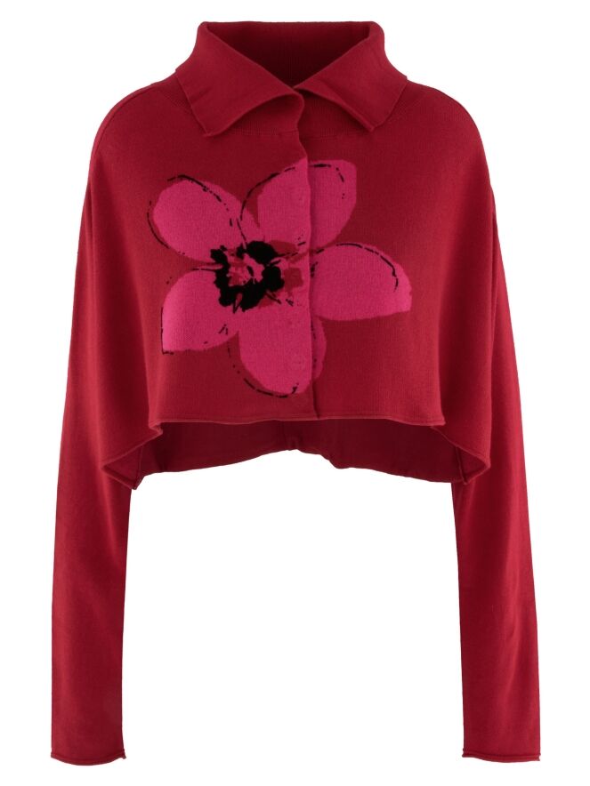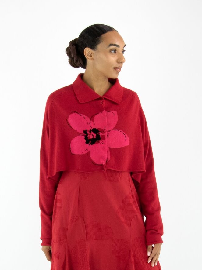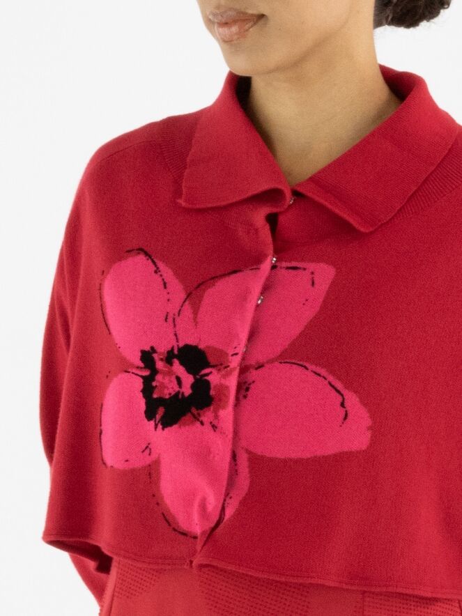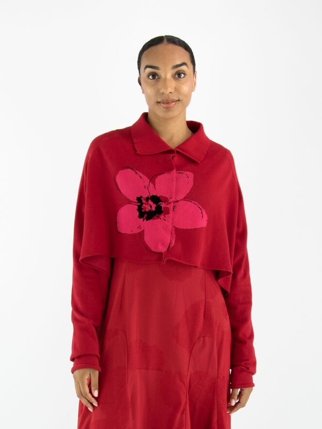 Een wijd, kort vest van Rundholz Black Label in rood, met op de voorkant een print van een grote bloem in pink en zwart. Het vest sluit met drukknopen en heeft een kraag van fijn geribbelde tricot. Dit vest mag met de hand worden gewassen.