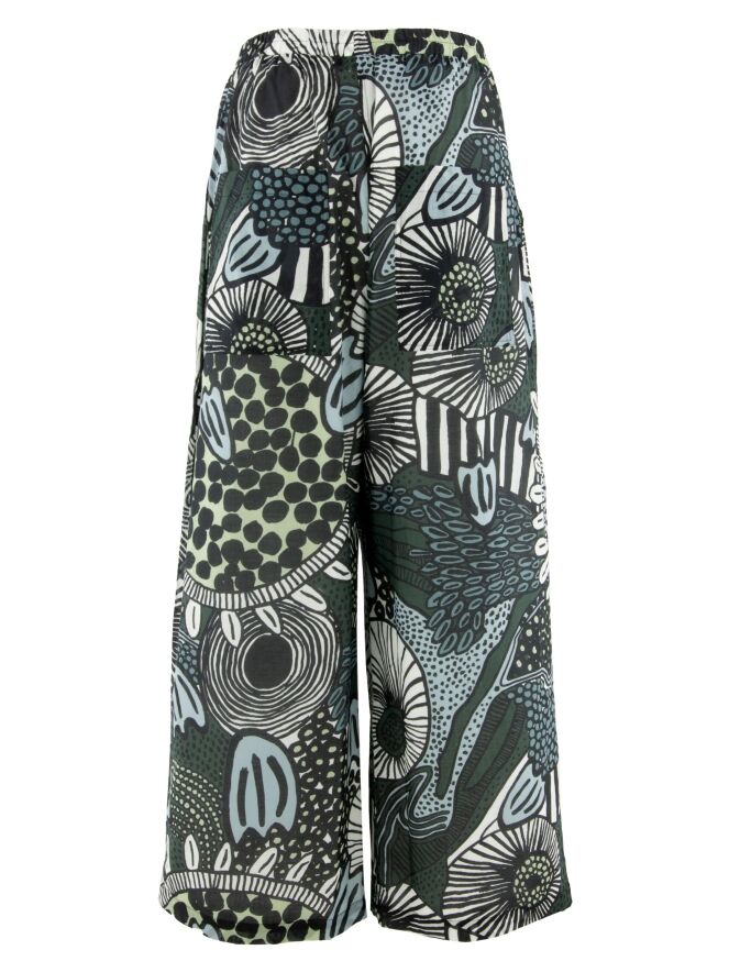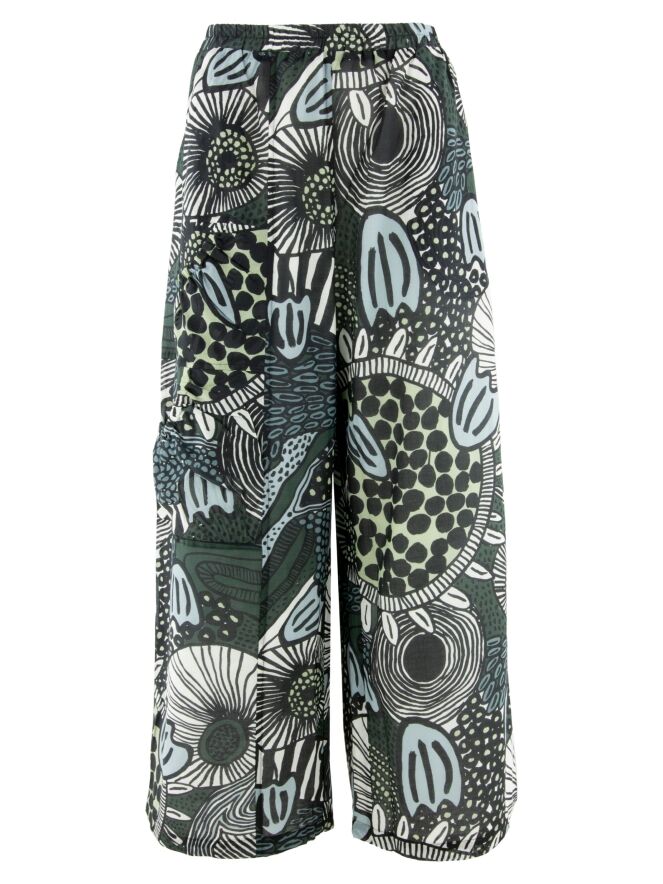 Wijde cargobroek van Rundholz Black Label in een grafische art-decoprint met meerdere groentinten, zoals mint en olijfgroen, gecombineerd met petrolblauw, zwart en wit. In de taille is een fijn geplooide elastische band verwerkt, wat zorgt voor een comfortabele en eigentijdse pasvorm. De broek heeft steekzakken en onder de zak op de rechterpijp zijn twee extra zakken aangebracht met een ronde belijning, waarlangs de stof fijn geplooid is. Deze broek kan op 30 graden worden gewassen.