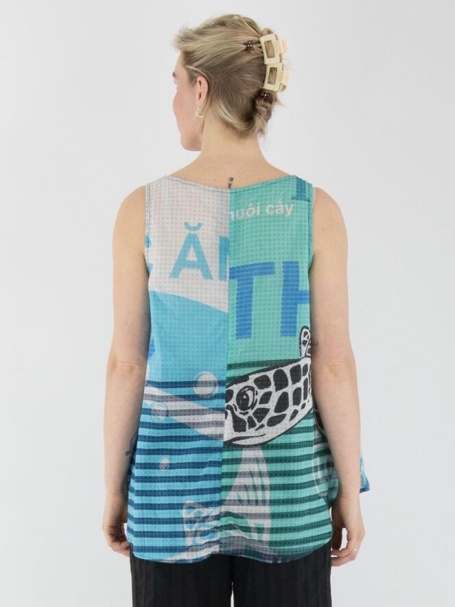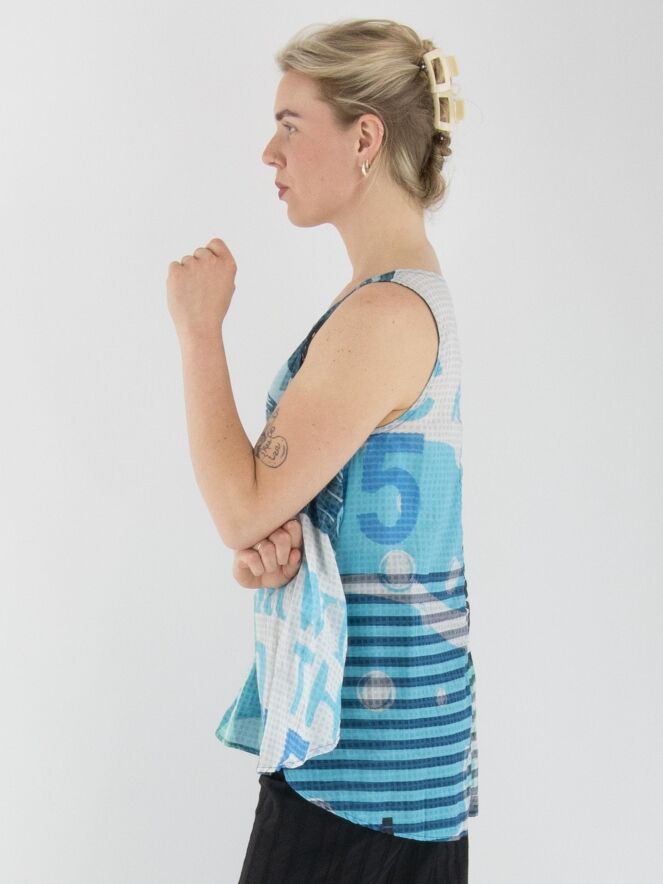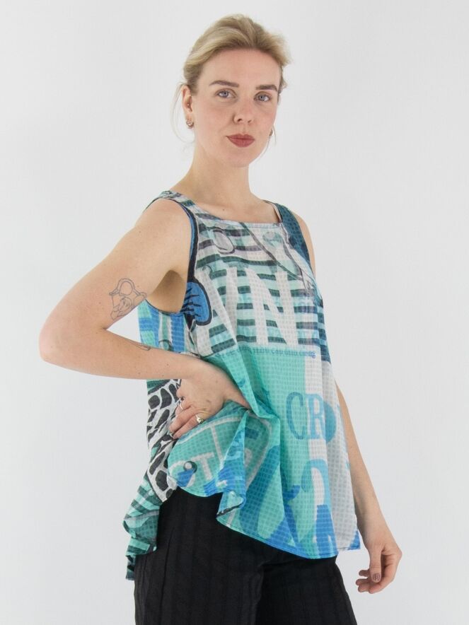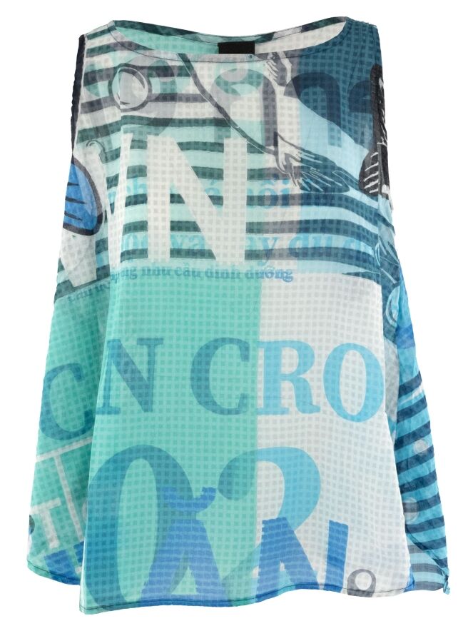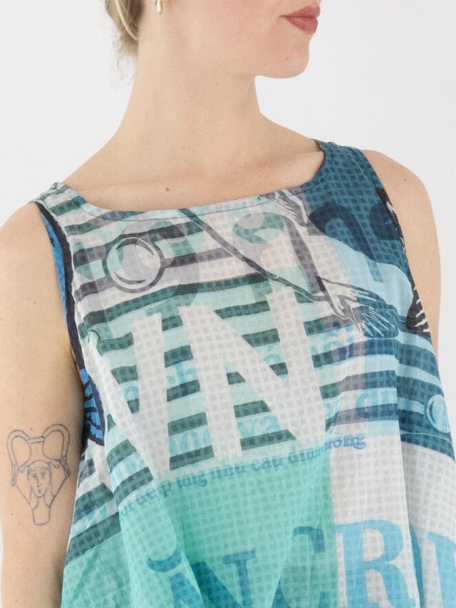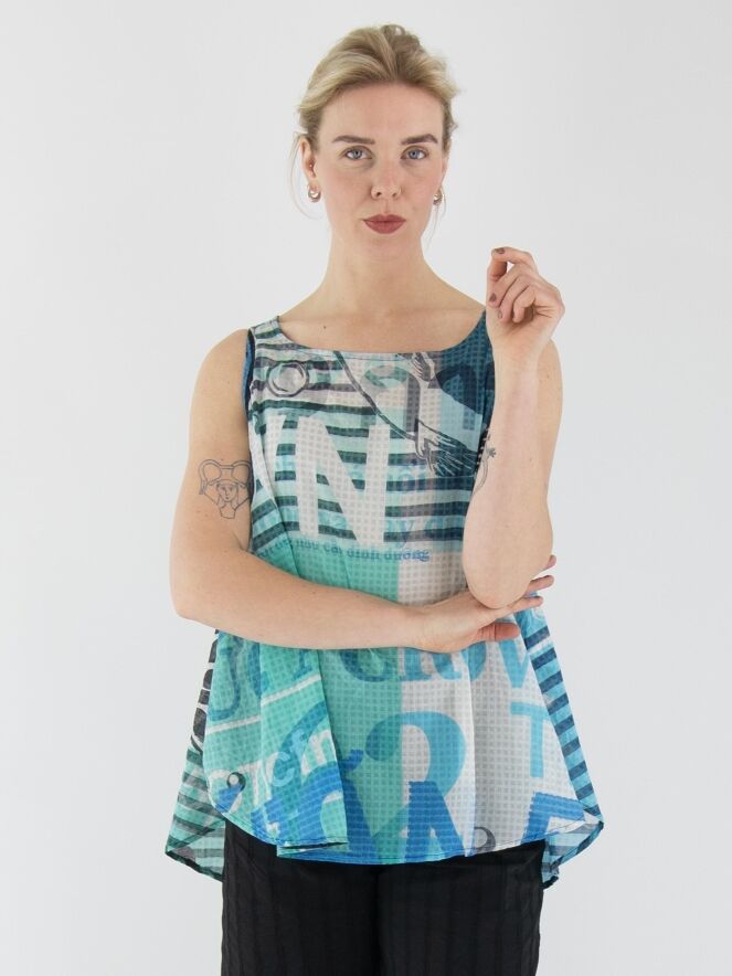 Een licht transparante top van Rundholz Black Label met een print van teksten en een blokmotief. In de print zijn meerdere tinten turquoise verwerkt, gecombineerd met wit en zwart. De top heeft een A-lijn en mag op 30 graden worden gewassen.