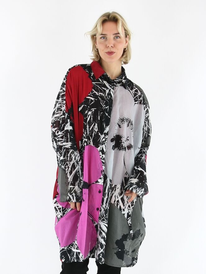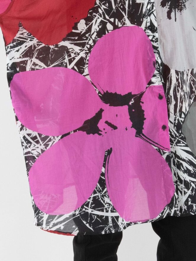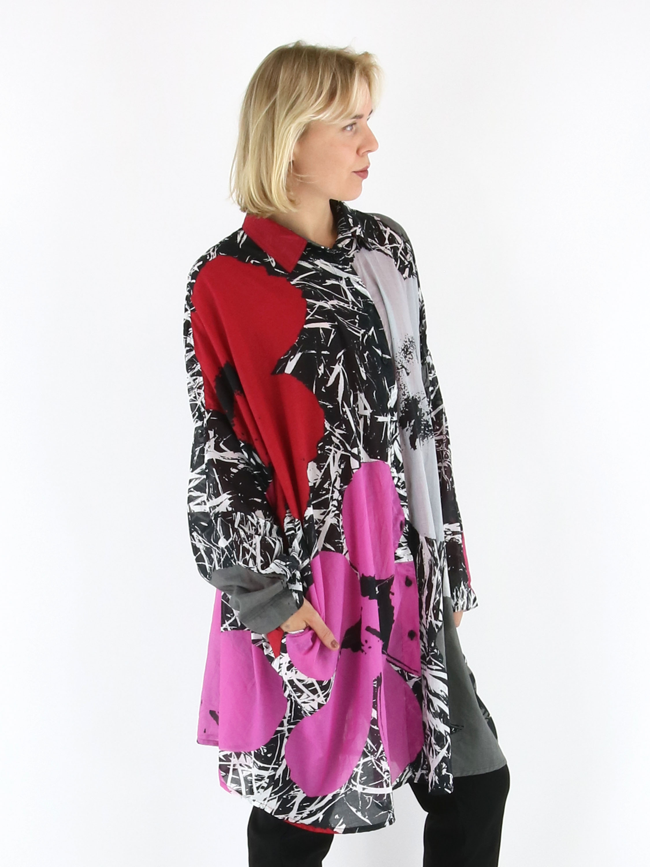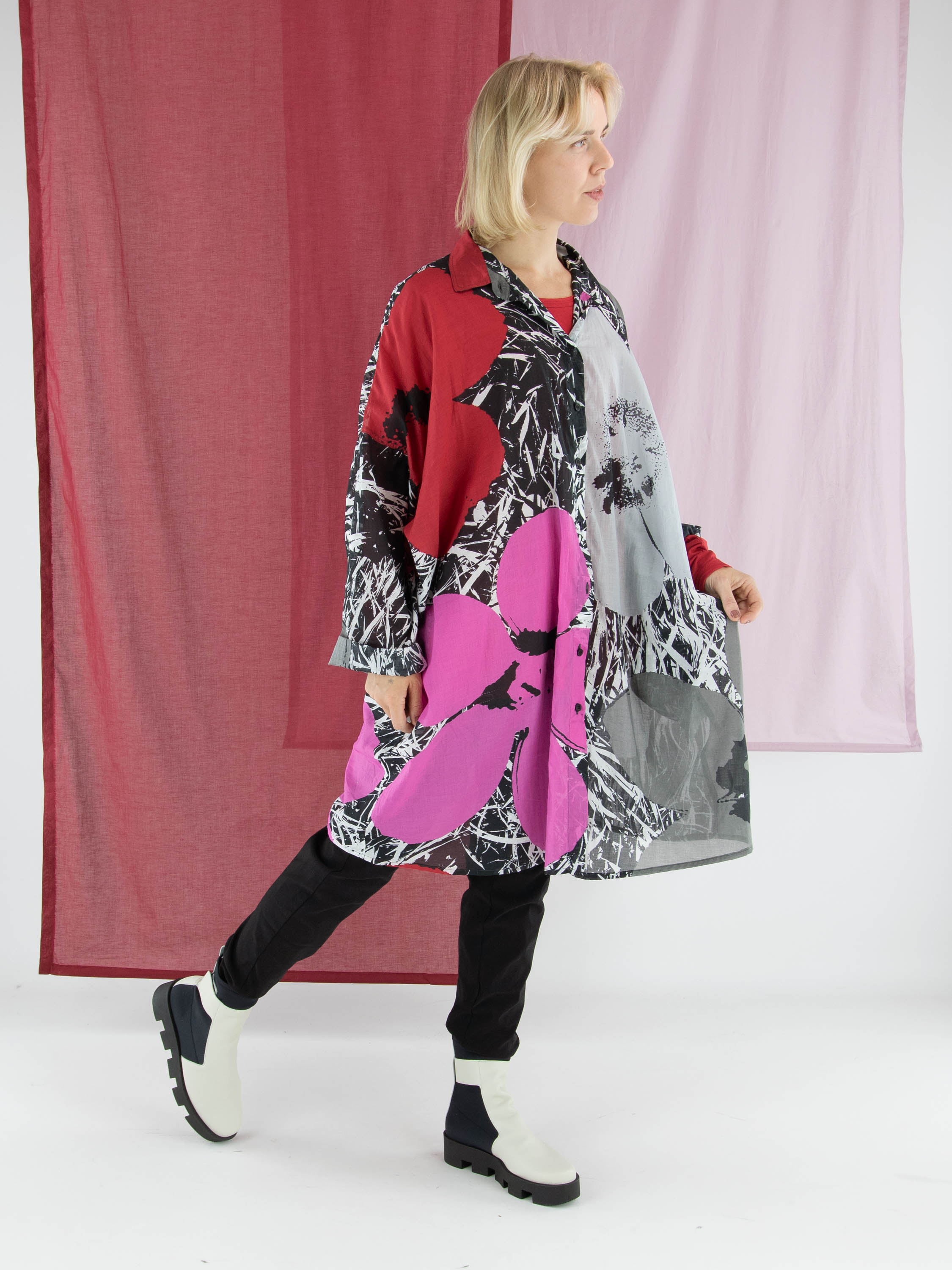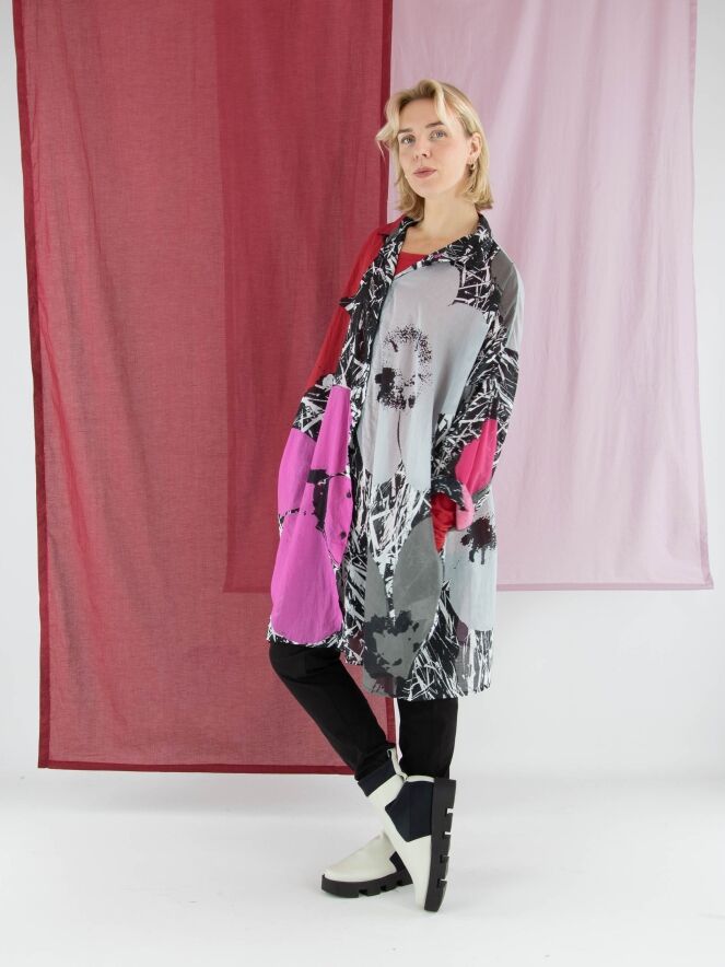 Een lange, wijde en licht transparante blouse van Rundholz Black Label met een print van grote bloemen op een grafische achtergrond. De bloemen zijn uitgevoerd in licht- en donkergrijs, pink en rood. Deze blouse mag op 30 graden worden gewassen.