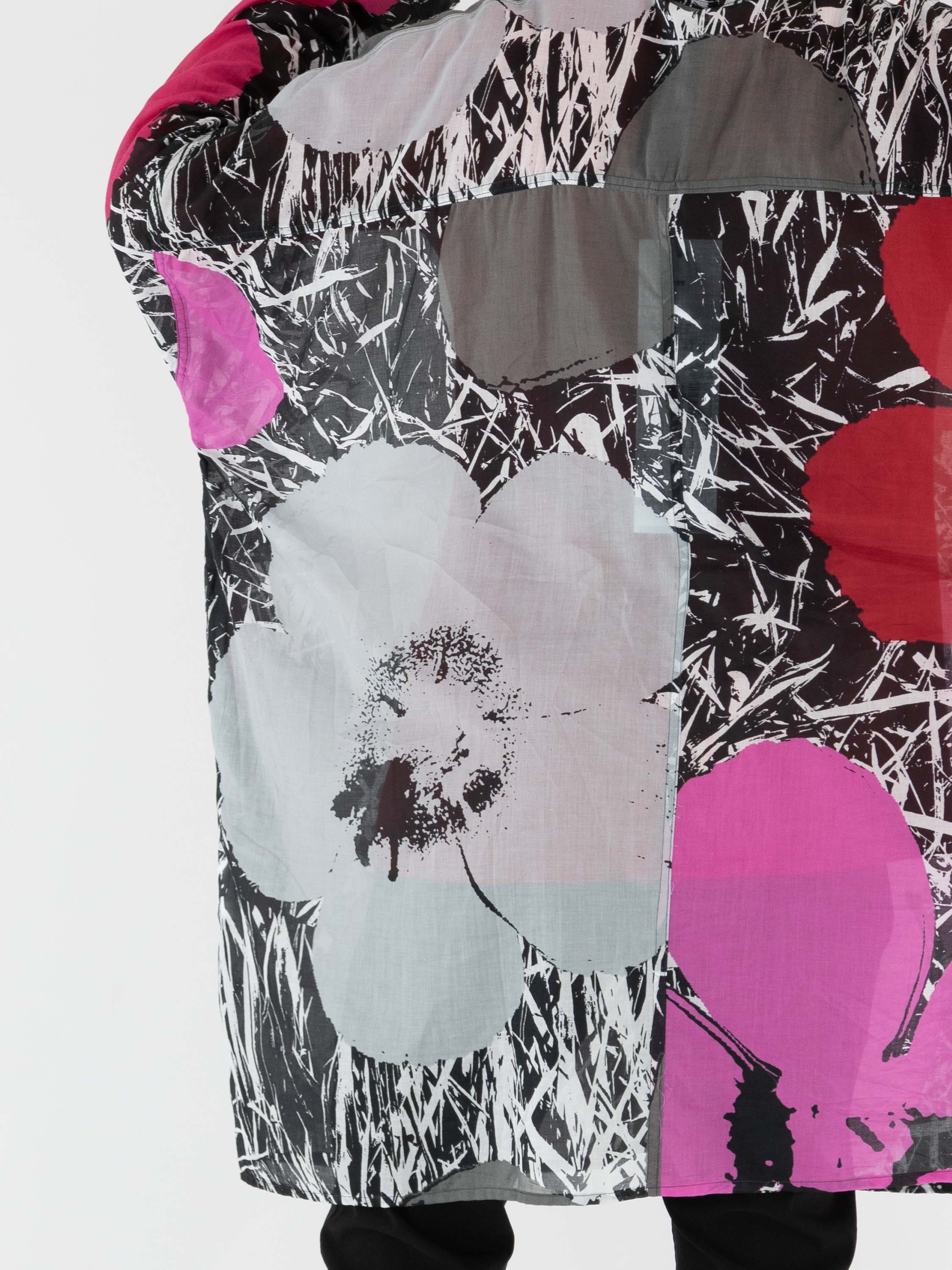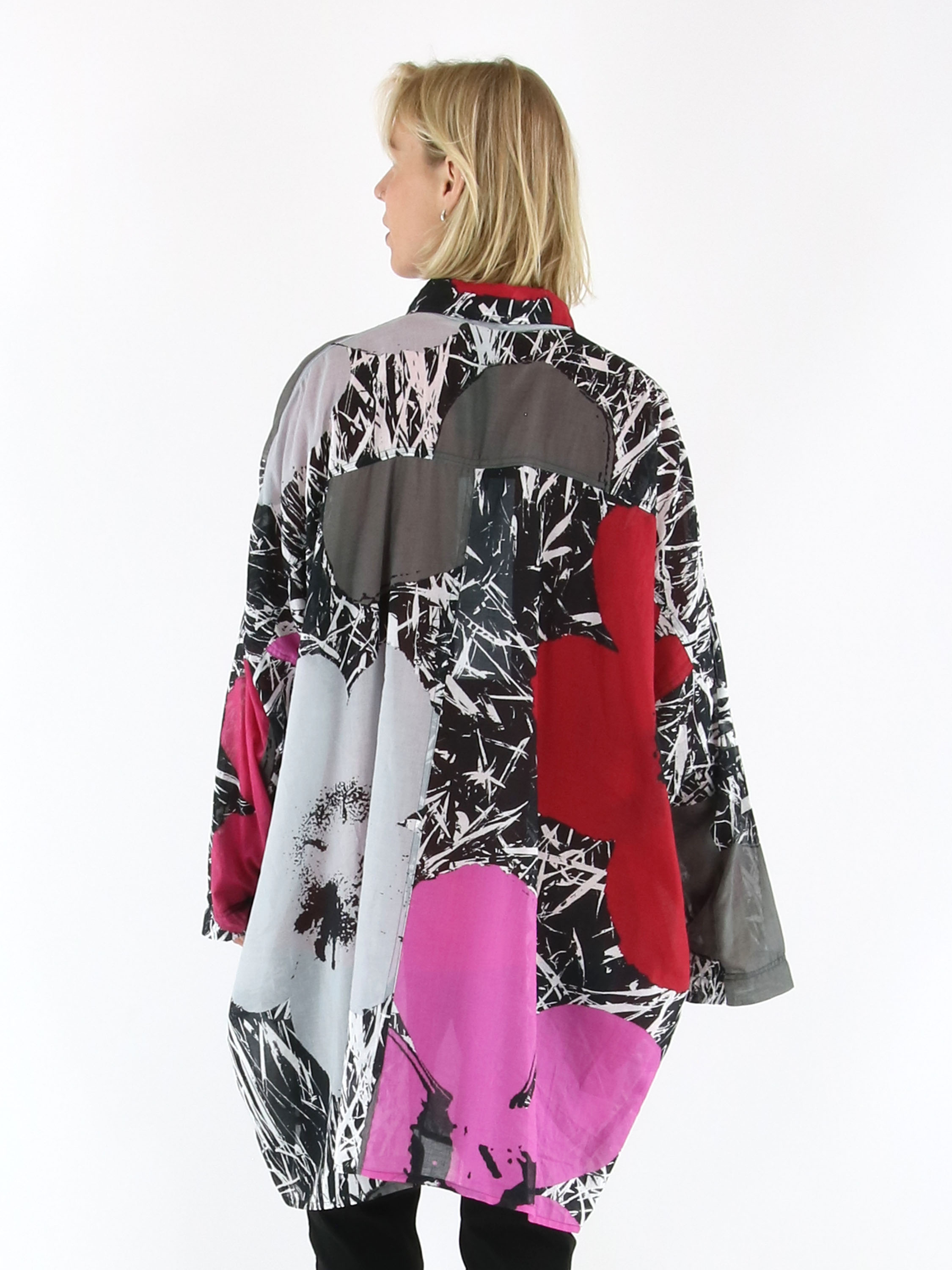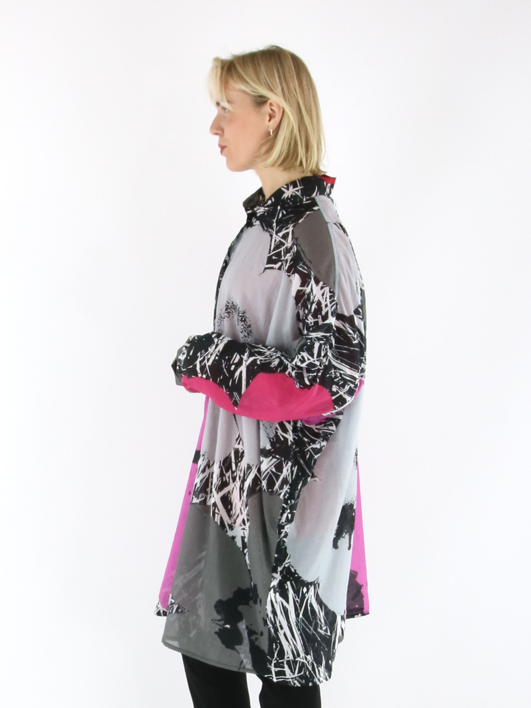Een lange, wijde en licht transparante blouse van Rundholz Black Label met een print van grote bloemen op een grafische achtergrond. De bloemen zijn uitgevoerd in licht- en donkergrijs, pink en rood. Deze blouse mag op 30 graden worden gewassen.