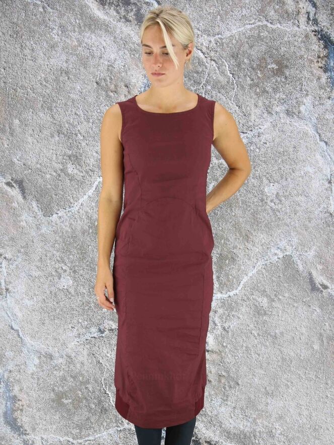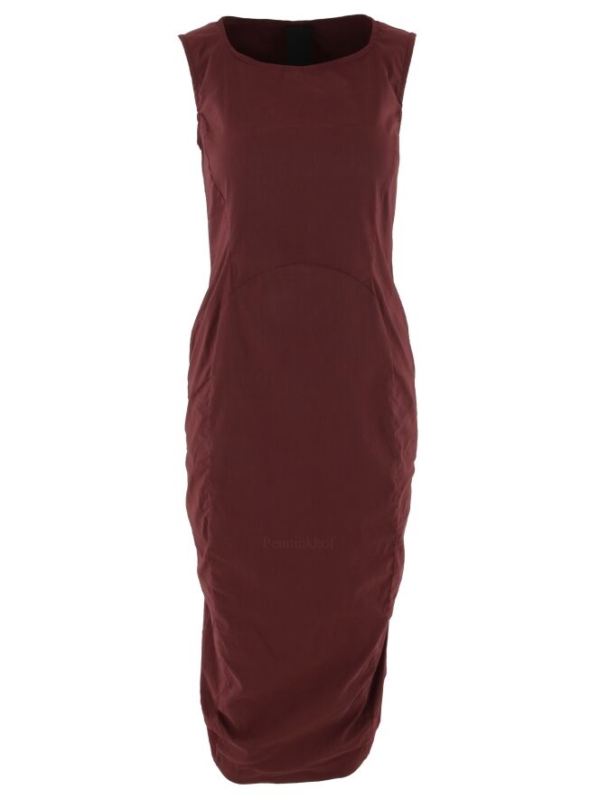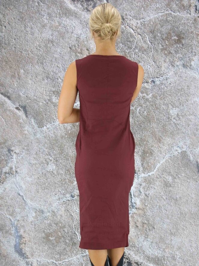 Een aangesloten jurk van Rundholz Black label in een bordeaux rode kleur. Aan de onderkant is aan beide zijkanten een brede fijn geribbelde tricot boord. Deze jurk mag op 30 graden worden gewassen.