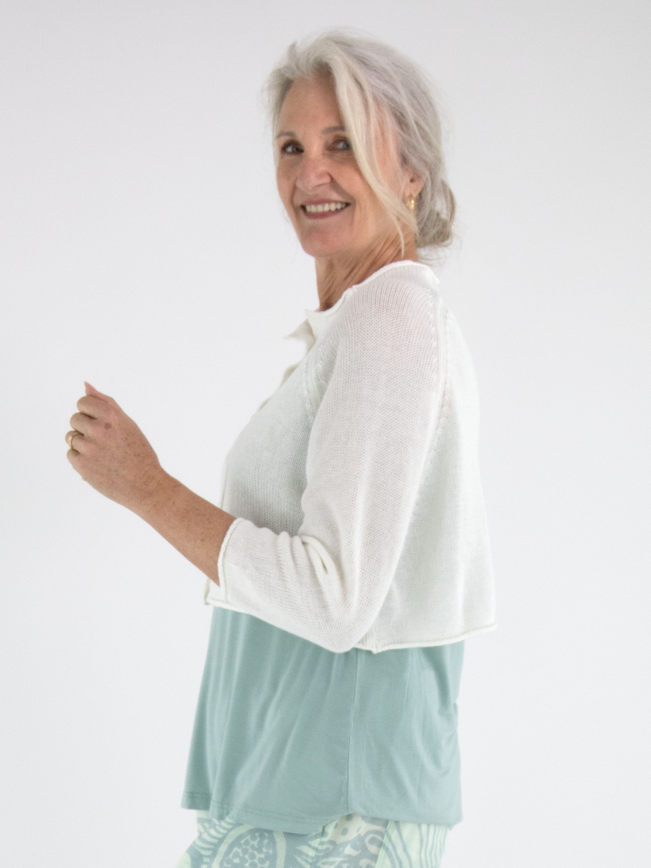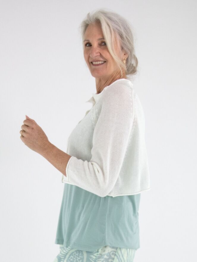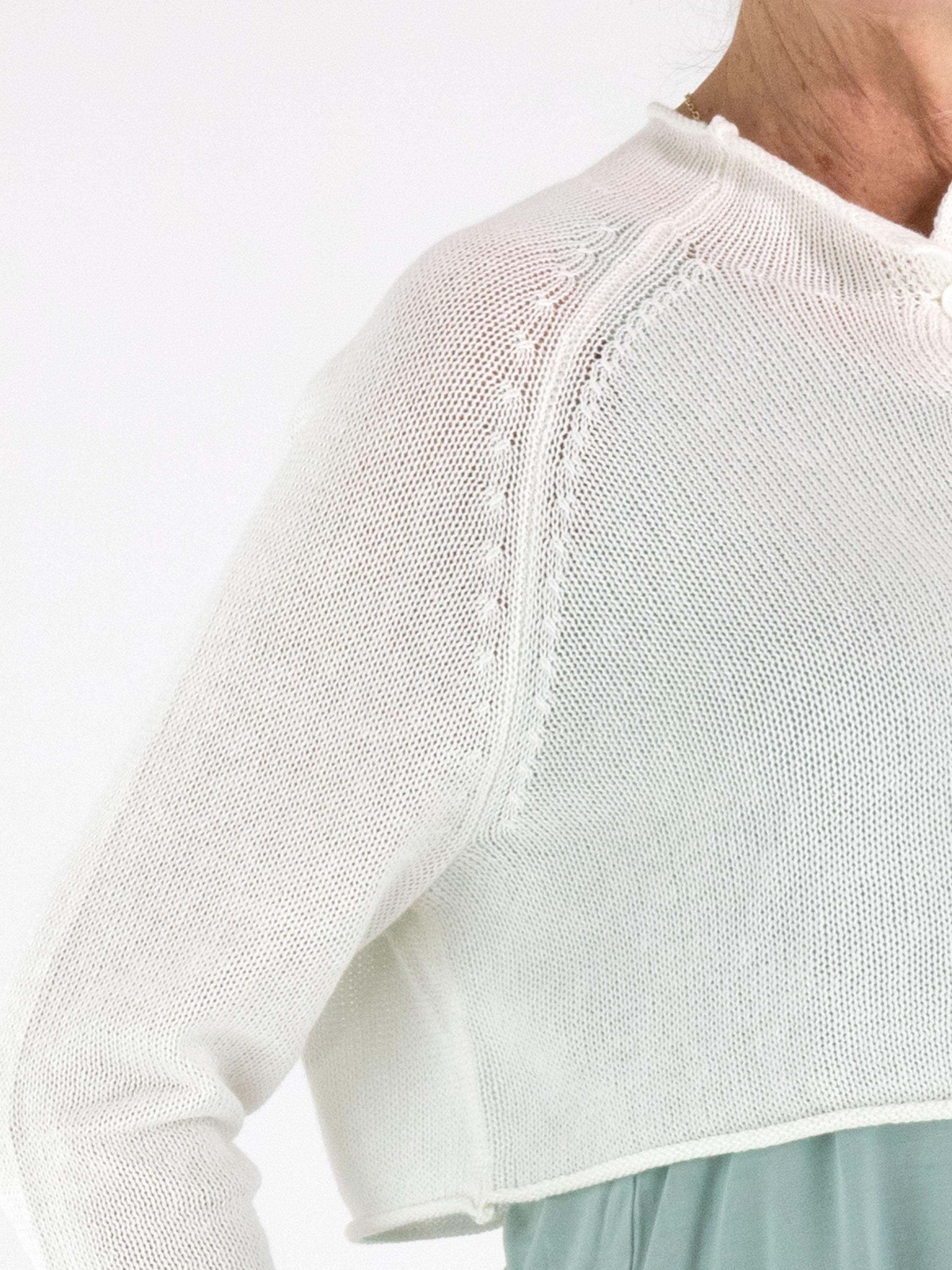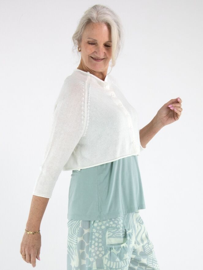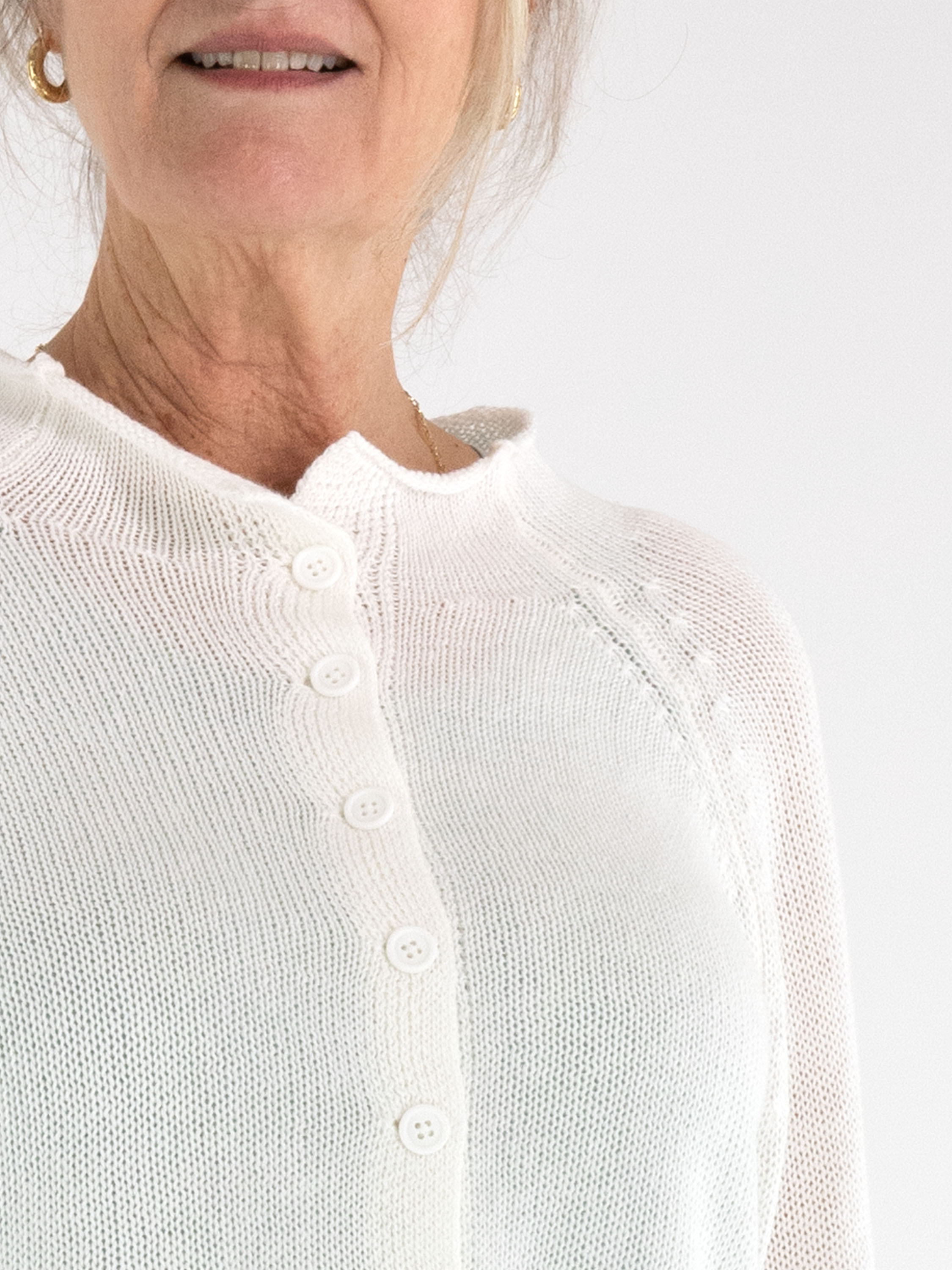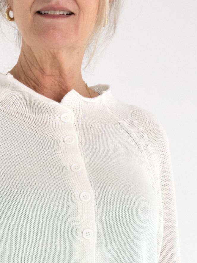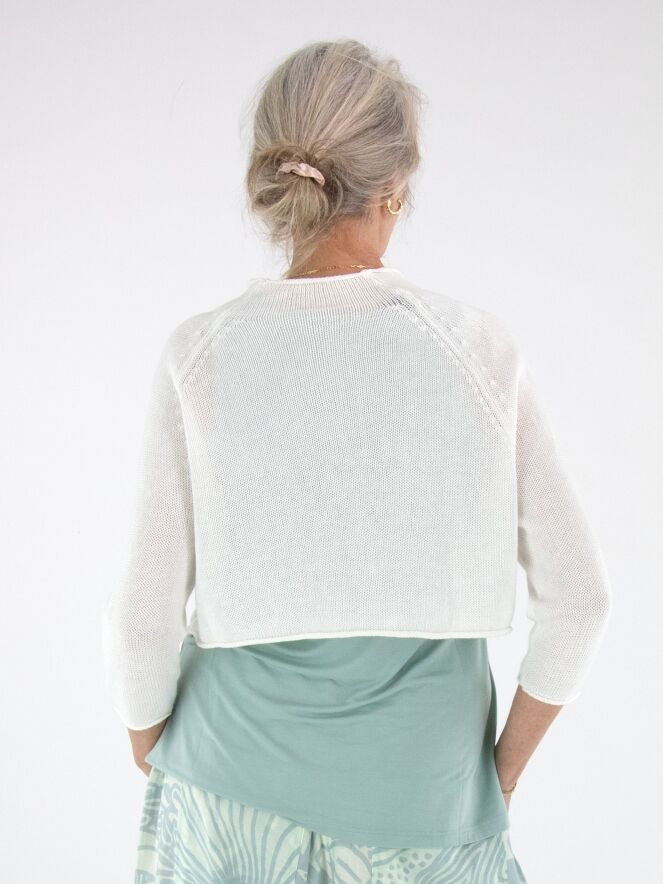 Kort, ruimvallend vest van Rundholz Black Label in de kleur wit. Het vest is opengebreid en heeft korte mouwen. De randen zijn licht geruld, wat zorgt voor een nonchalante en eigentijdse uitstraling. Zowel open als gesloten is dit vest zeer geschikt om te dragen over een lange jurk tijdens een zomerse avond. Dit vest kan met de hand worden gewassen.