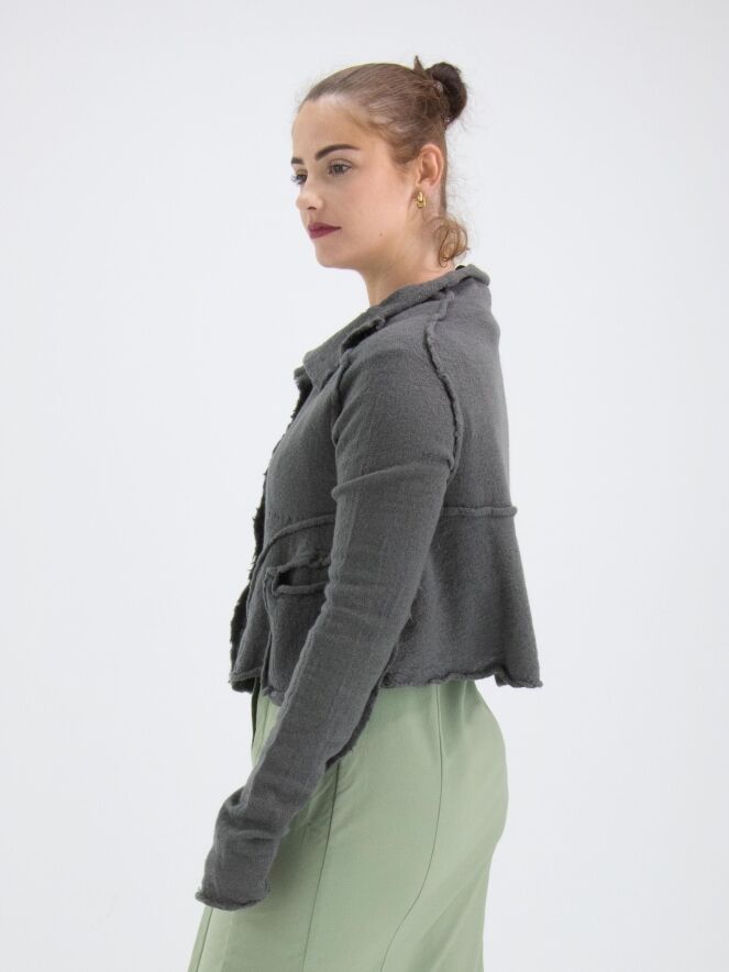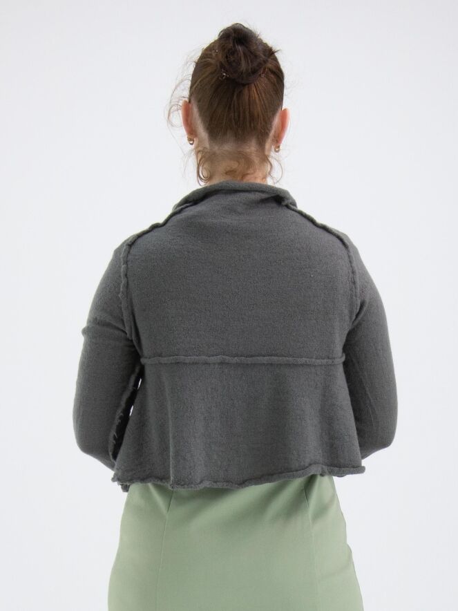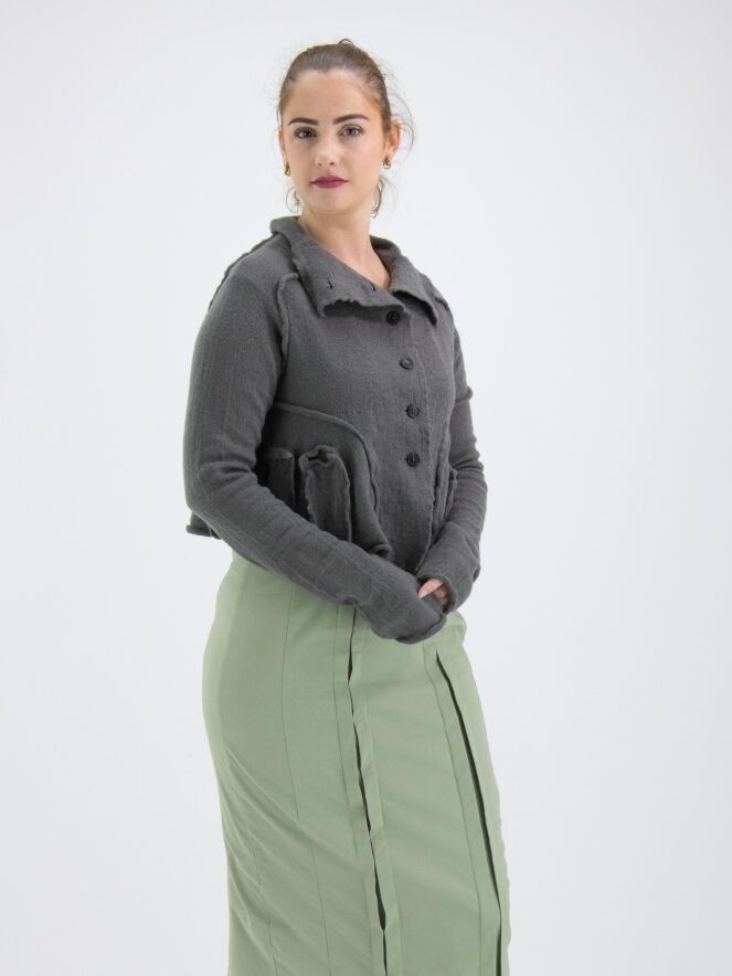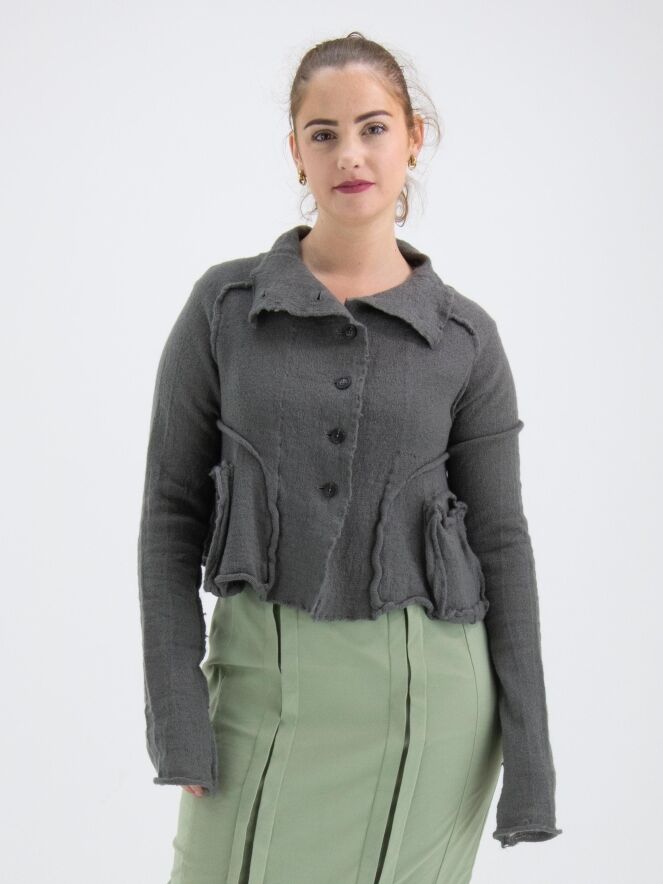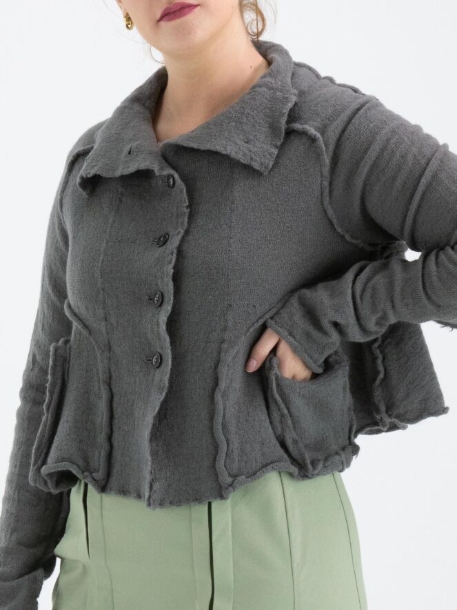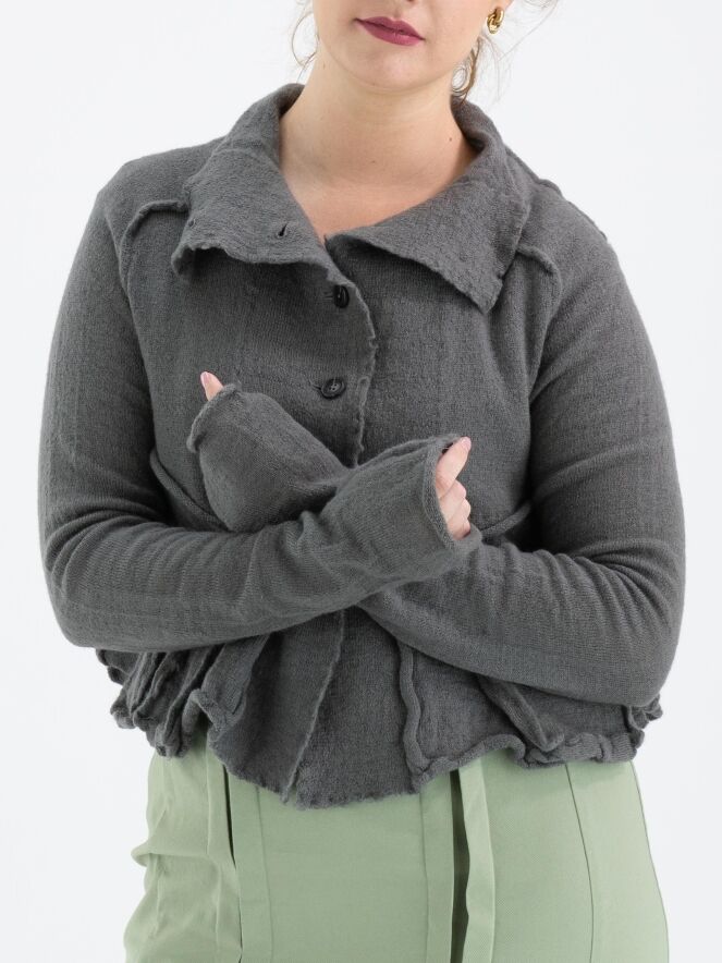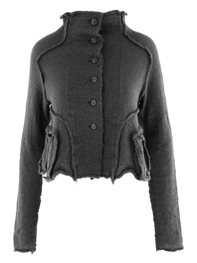 Een kort vest van Rundholz Black Label in de kleur grijs. Aan de voorzijde zijn meerdere zakken met verschillende afmetingen. De randen van de omgekeerde stiknaden zijn geruld. Dit vest mag met de hand worden gewassen.
