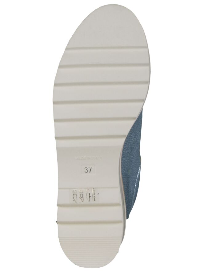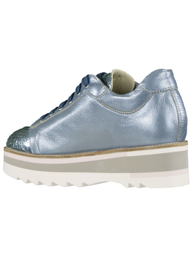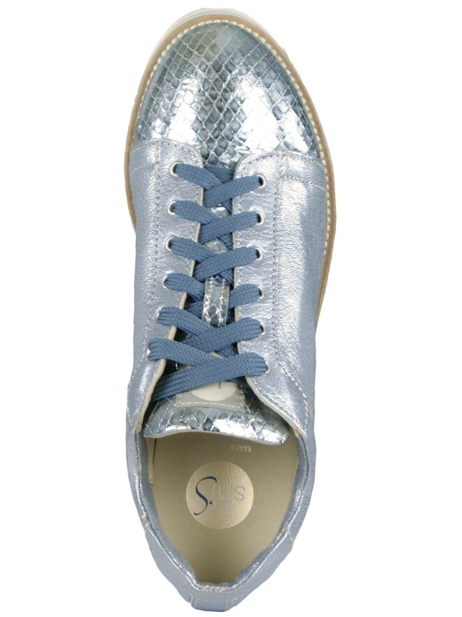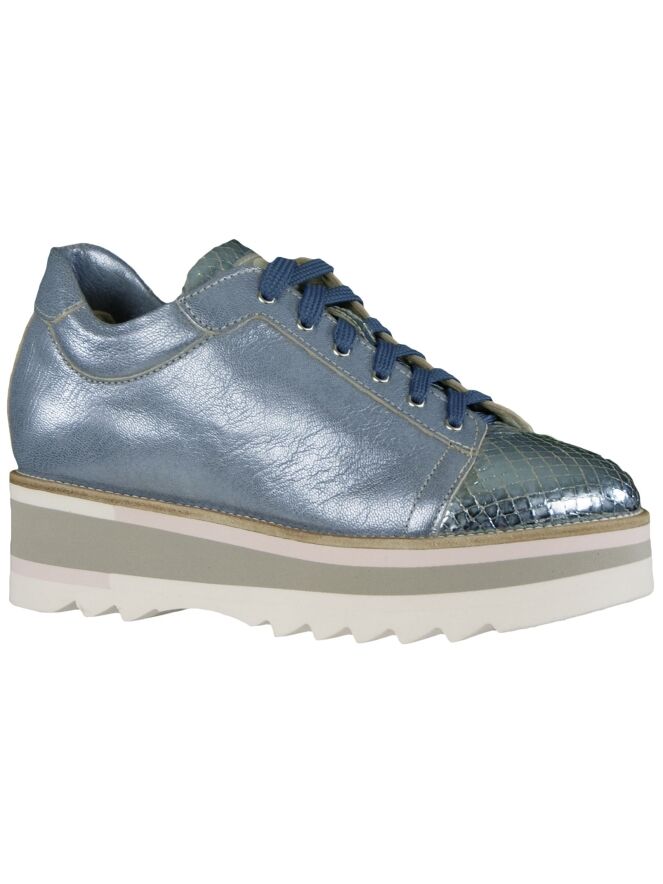 Een sneaker van het merk Shi's in een metallic blauwe kleur. De neus is in een reptiel print. De plateau zool heeft als hoofdkleur roomwit met grijs en een smalle lijn in pastel roze. De binnenkant van de sneaker is met leder gevoerd.