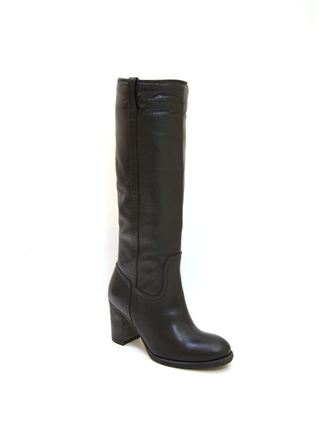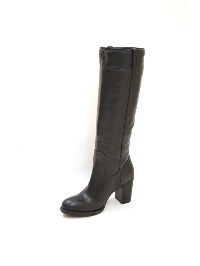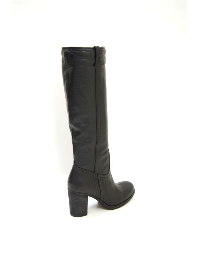 Een tube laars van het merk Spazio Moda in een zwarte kleur. De laars heeft een sportieve fijn geribbelde zool. Langs de schacht lopen aan beide zijkanten een lederen bies. De schachthoogte is 40 cm en de omtrek is 37 cm. De binnenkant van de schacht is met imitatiebont gevoerd.