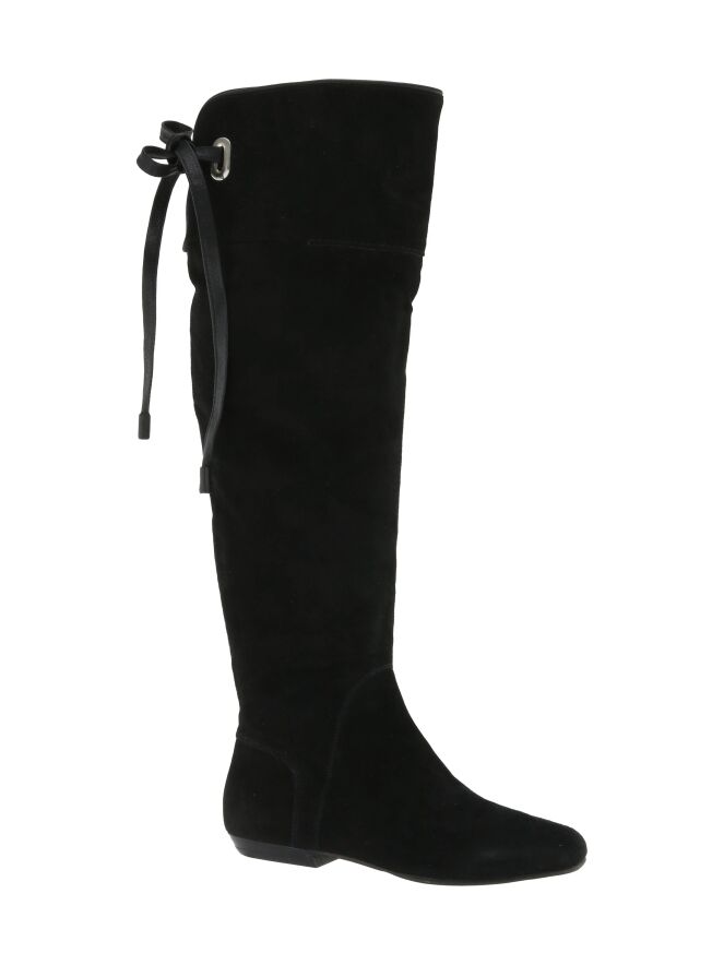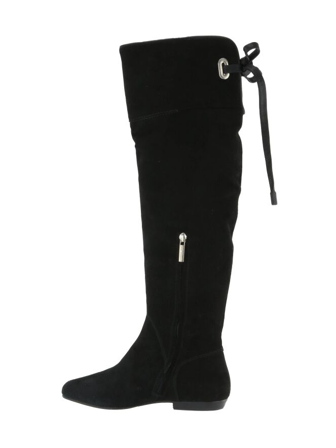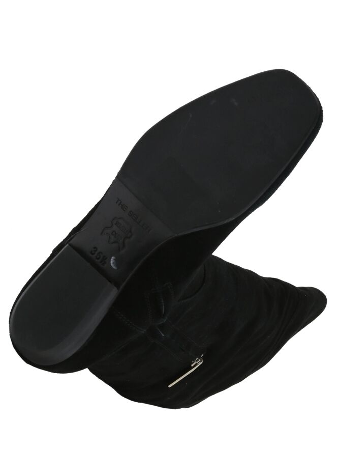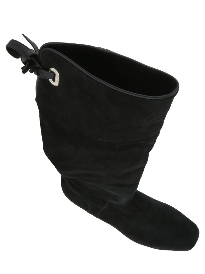 Een hoge laars van het merk Spazio Moda in de kleur zwart. Aan de bovenkant van de schacht is aan de achterzijde een korte uitsnijding met een lederen koord waarmee een decoratieve knoop kan worden gemaakt. De rand van de schacht heeft een lederen bies.