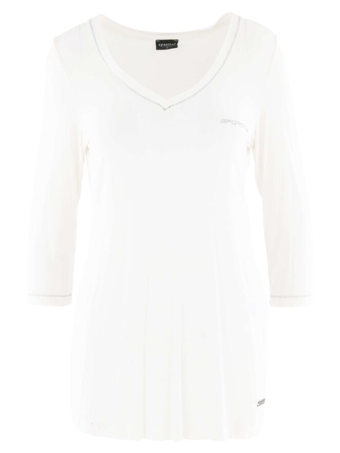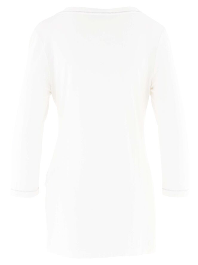 Een lang shirt in de kleur roomwit van Sportalm. Langs de rand van de V - Hals en het uiteinde van de mouwen is een grijze stiknaad. Dit shirt mag op 30 graden worden gewassen.