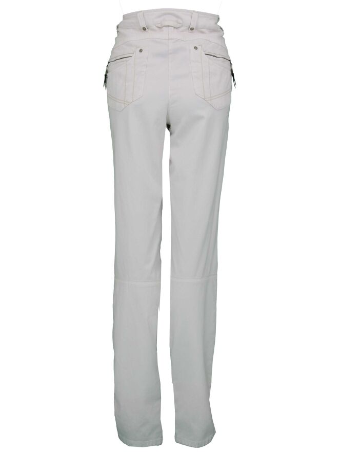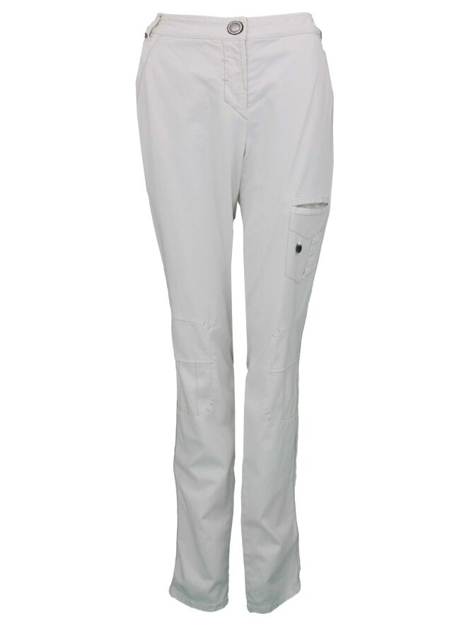 Een broek van Sportalm in een roomwitte kleur.Ter hoogte van de knieën zijn decoratieve stiksels en op het linker bovenbeen is een decoratieve zak. De broek heeft steekzakken en mag op 30 graden worden gewassen.