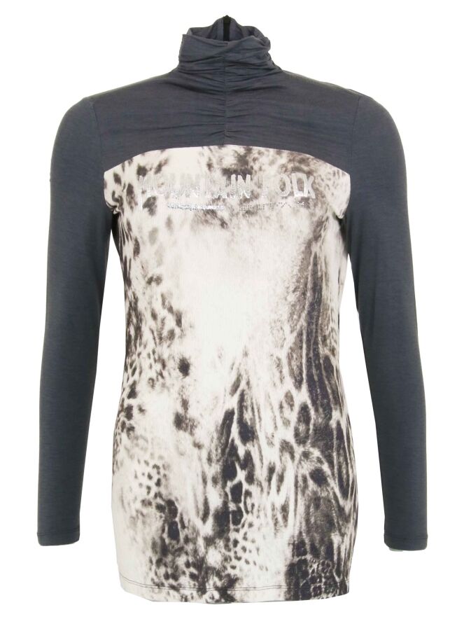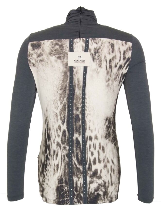 Een lang shirt van Sportalm in de kleur grijs met aan de voor en achterzijde een vlak met een panter print in de kleuren roomwit met bruin. Aan de achterkant zijn in het midden 2 grijze biezen met stras steentjes. In de hals is een geplooide turtle coll. Dit shirt mag op 30 graden worden gewassen.