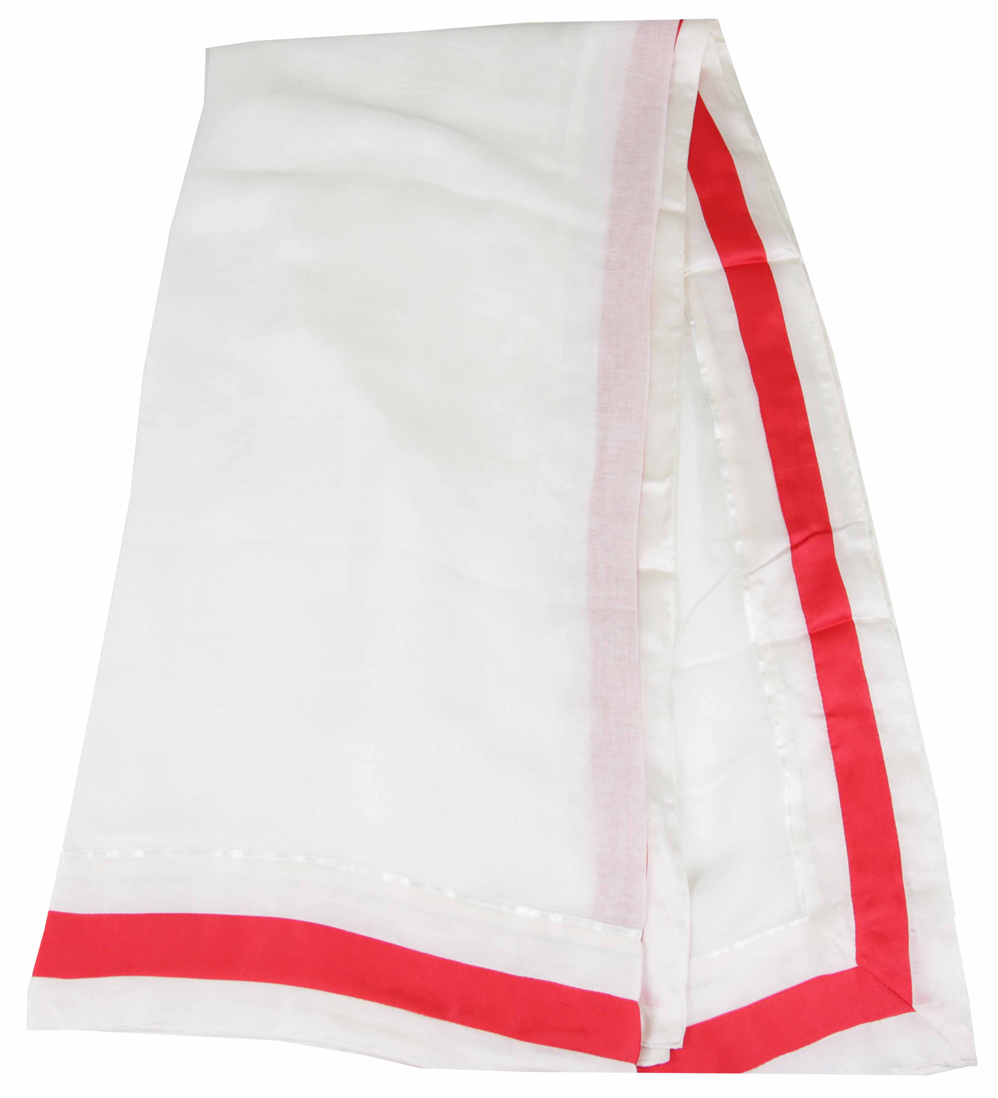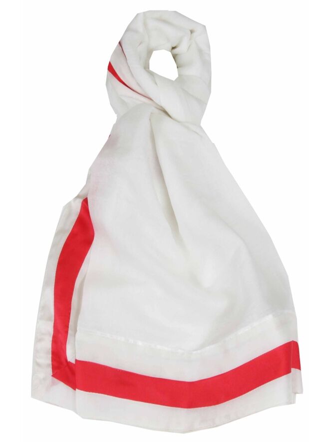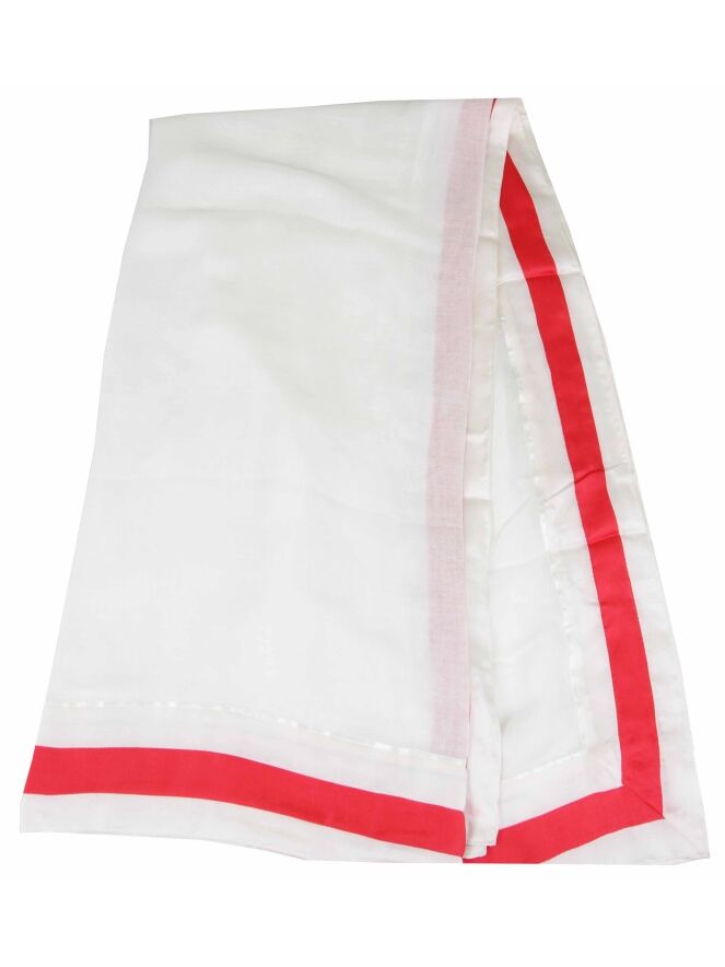 Een transparante shawl van het merk Stroke in een roomwitte kleur. De rand is van zijde en heeft een smalle rood kleurige bies. Deze shawl mag niet worden gewassen.