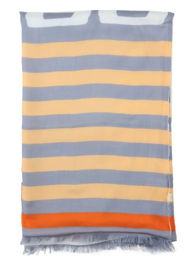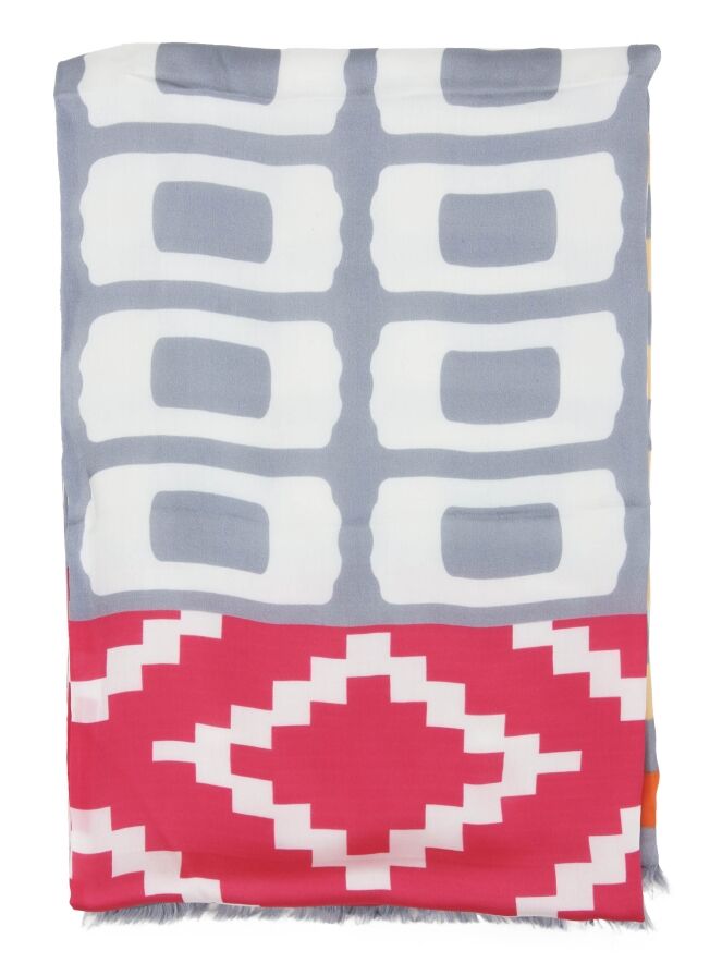 Een luxe shawl van stroke met een één zijde een grafische print met de kleuren peche, fuchsia, lichtgrijs en wit. de andere zijde is in een uni wittte kleur. Deze shawl mag niet worden gewassen.
