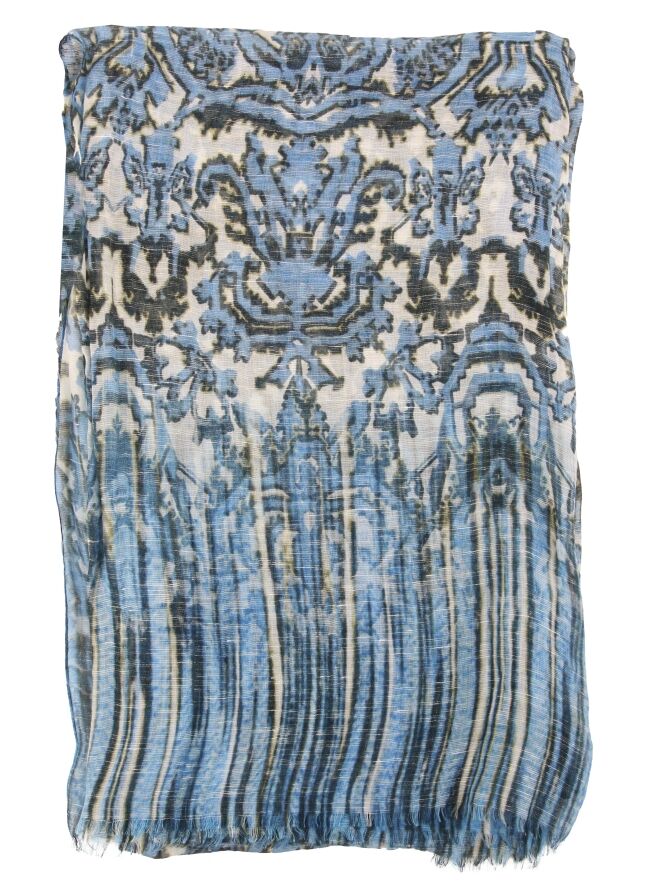 Een luxe shawl van stroke in een grafische print met meerdere tinten blauw en roomwit. De uiteinden van de shawl zijn fijn gerafeld. Deze shawl mag niet worden gewassen.
