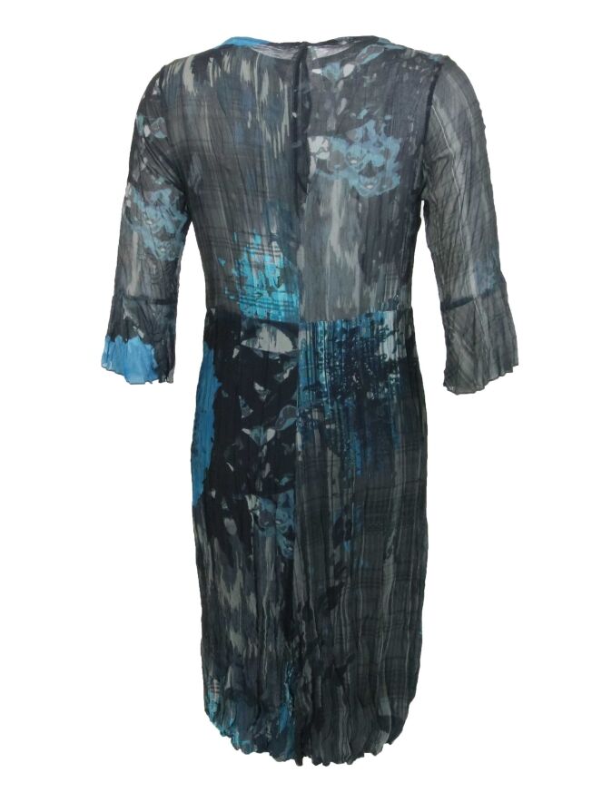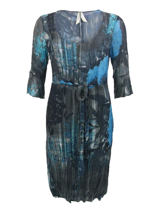 Een jurk van Summum in een grafische print met meerdere tinten aqua blauw en zwart. De jurk heeft een gekreukte stof en halflange mouwen. in de taille is een ceintuur in hetzelfde materiaal als de jurk. Vanaf de onderzijde van de ruime ronde hals zijn meerdere knoopjes. Deze jurk mag op 30 graden worden gewassen.