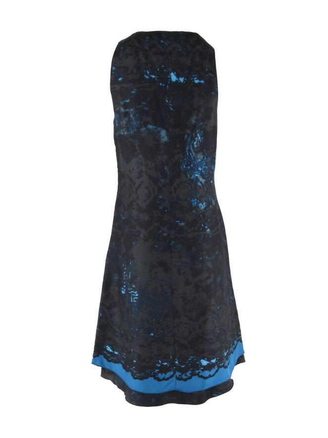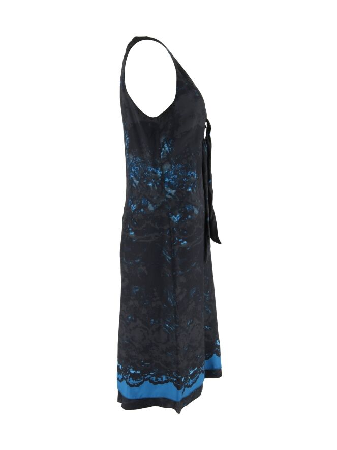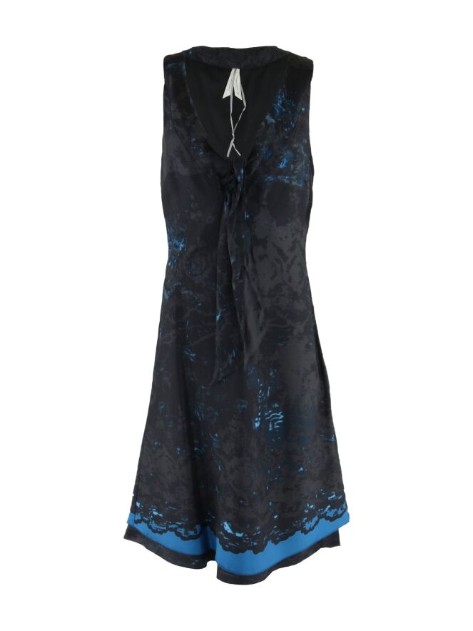 Een jurk van Summum in een grafische print met meerdere tinten antraciet en aqua blauw. Aan de onderzijde van de V - Hals zijn 2 decoratieve linten De jurk heeft een dubbele stof en mag op 30 graden worden gewassen.