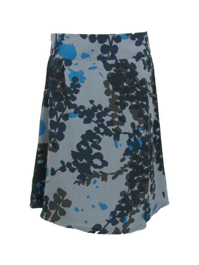 Een broekrok gestyled als een rok van Summum in een grafische bladprint met de kleuren aqua blauw en meerdere tinten grijs. Naast het midden van de voorzijde zijn 2 plooien vanuit de taille. De rok is gevoerd en mag op 30 graden worden gewassen.