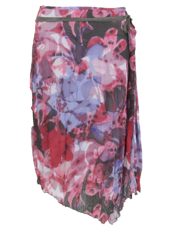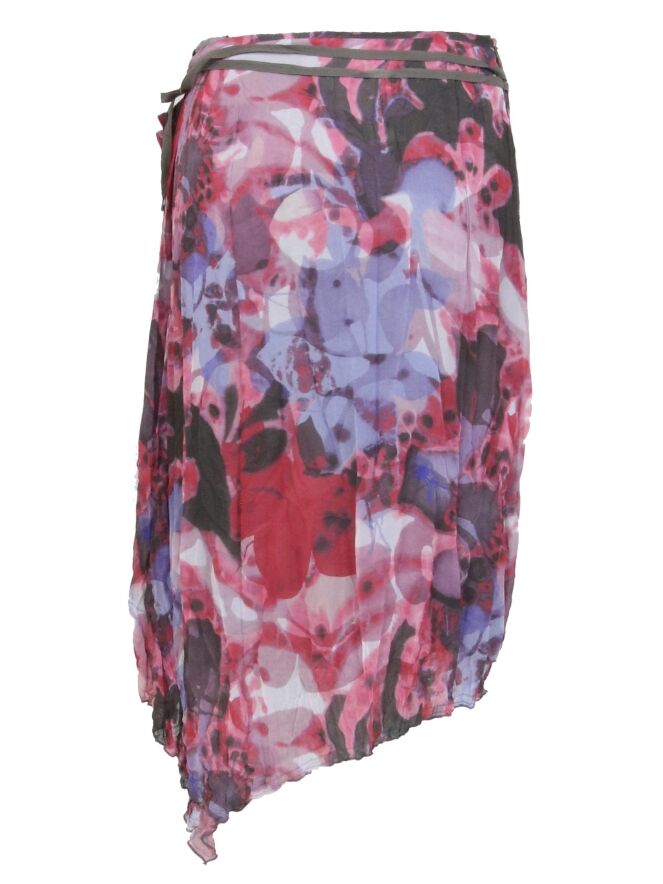 Een rok van Summum in een grafische bloemenprint met de kleuren rood, roze, lavendel en wit. In de taille is een lint ceintuur in de kleur taupe. De rok is gevoerd en mag op 30 graden worden gewassen.