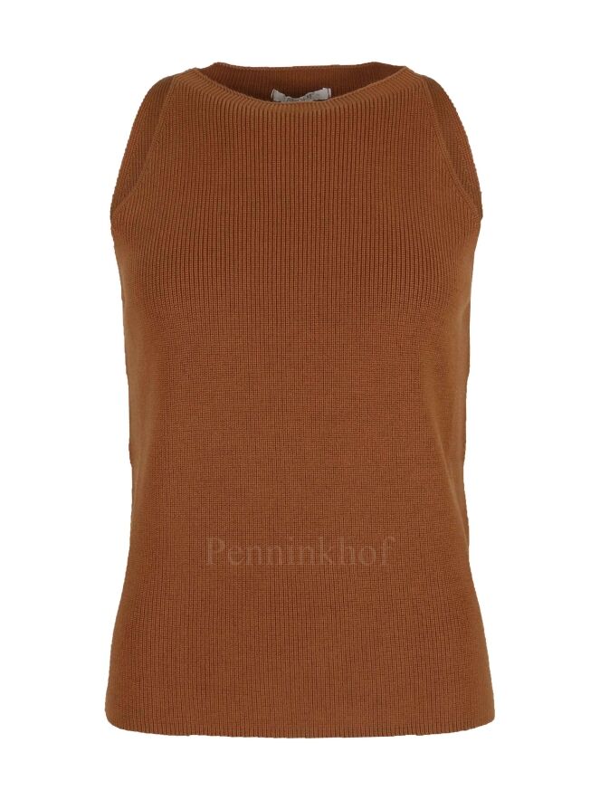 Een gebreide top van Tandem in de kleur bruin. De top heeft een ronde hals en mag op 30 graden worden gewassen.