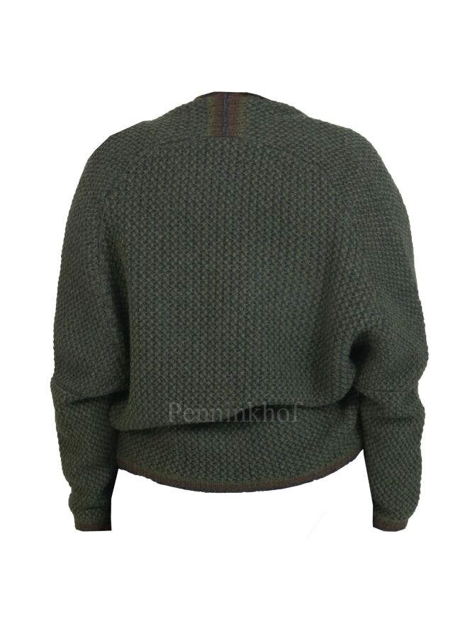Een gemêleerd vest van Transit in meerdere tinten groen. Langs de rand van de brede kraag is een gebreide bies met de kleuren grijs en bruin. Het vest heeft een sluiting met één knoop en mag op de hand worden gewassen.