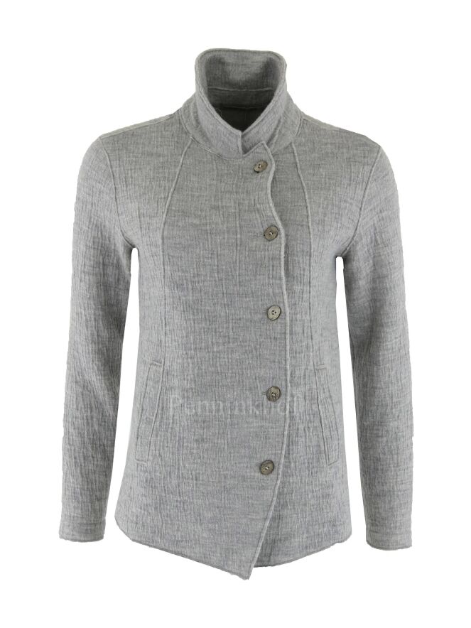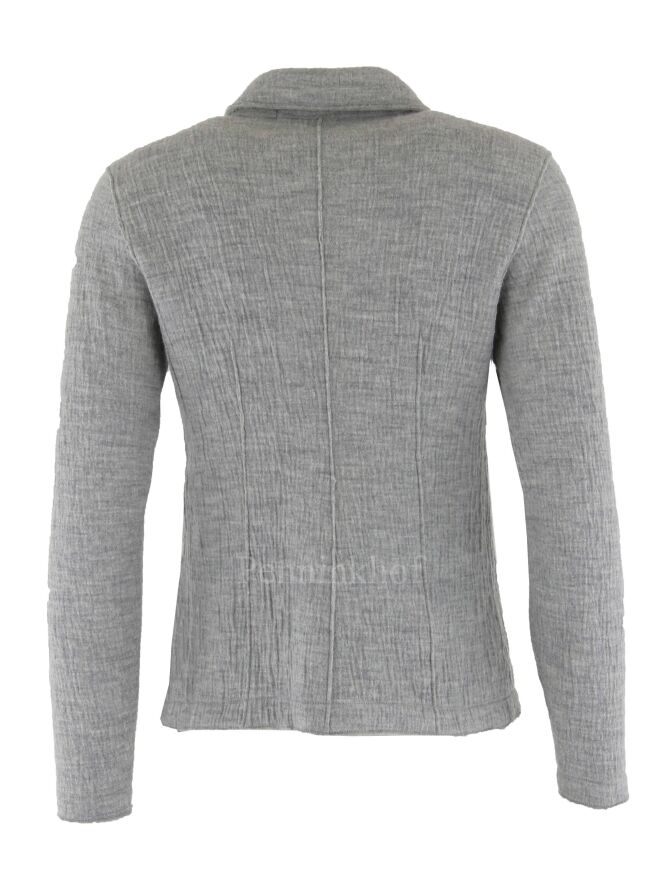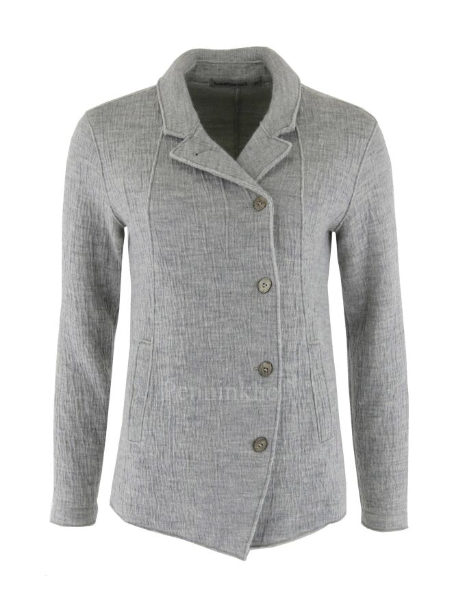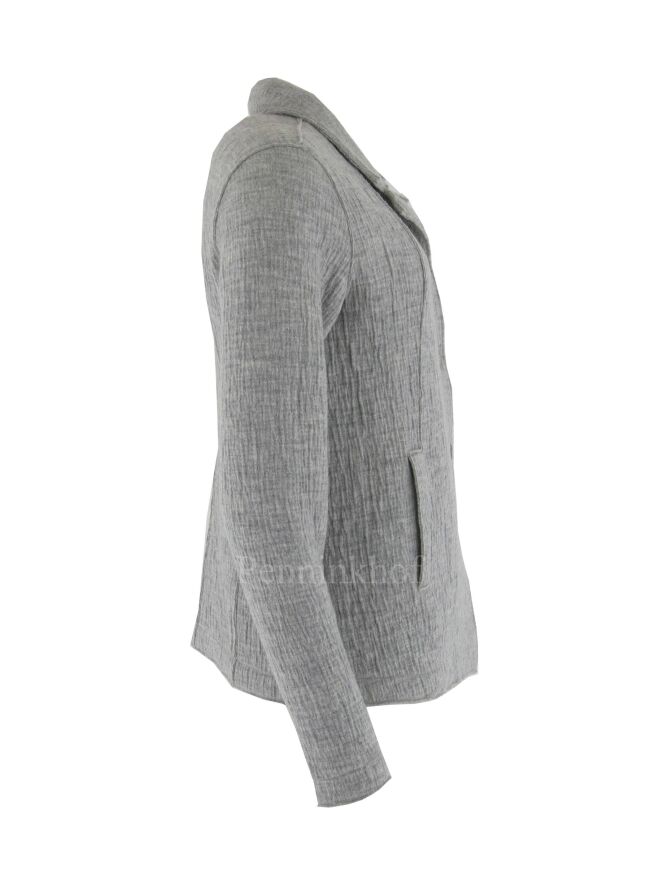 Een gemêleerde blazer van Transit in meerdere tinten grijs in een gerimpeld patroon. De blazer heeft een A - Symmetrische sluiting en heeft steekzakken. De blazer is ongevoerd en mag niet worden gewassen.