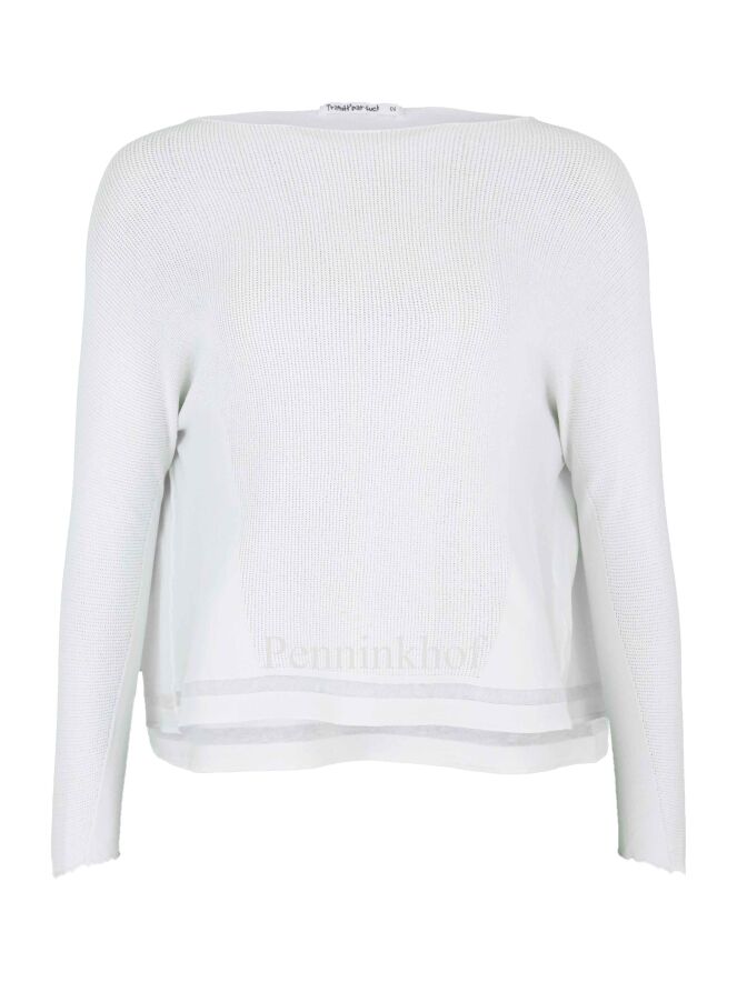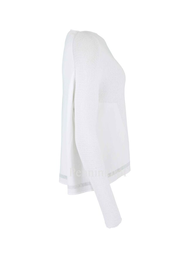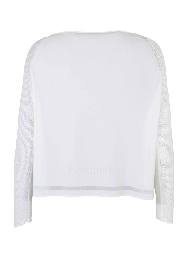 Een pullover van Transit in de kleur wit. De pullover heeft een ronde hals en De bovenkant van de schouders en de lange mouwen heeft een geperforeerde stof. Aan de onderkant van de pullover is een transparante bies. deze pullover mag op 30 graden worden gewassen.