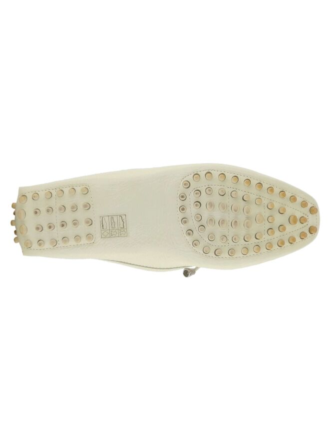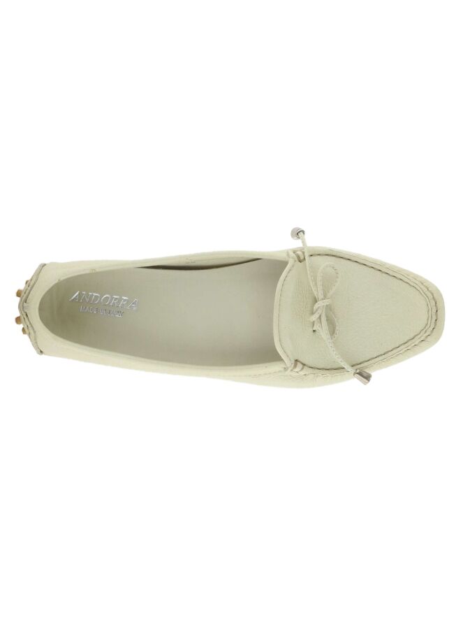 Een mocassin van valentin in de kleur roomwit. Op de voorvoet is een lederen strikje in de kleur beige. langs de schacht is een beige bies.