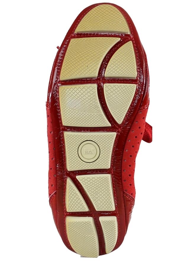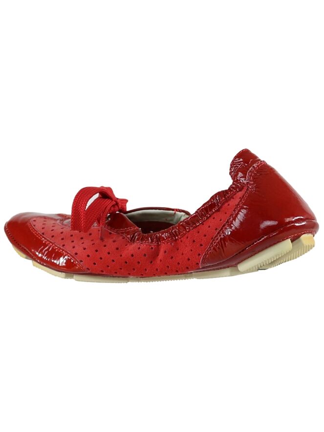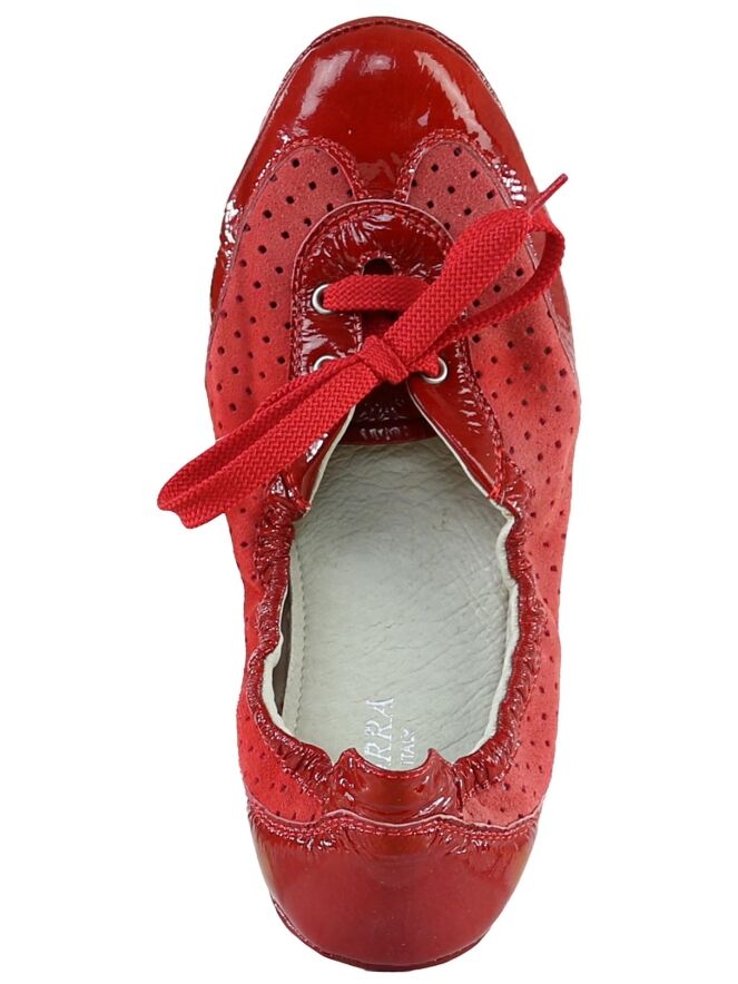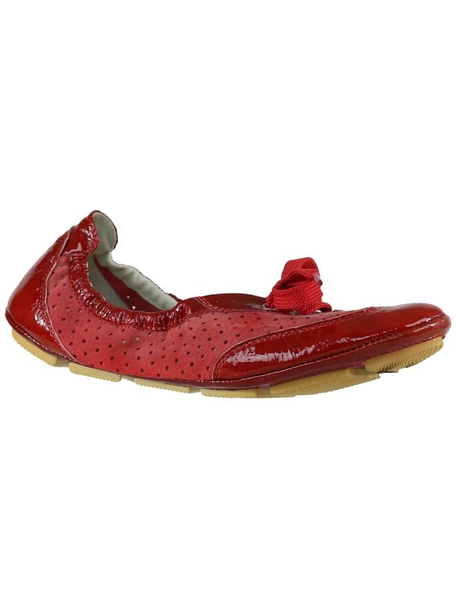 Een ballerina van Valentin in de kleur rood. De neus is in lakleder. Het leder is aan de zijkanten fijn geperforeerd. De hiel is in lak leder. Op de voorvoet is een rode veter. Langs de rand van de schacht is een bies met een elastieken verwerking.