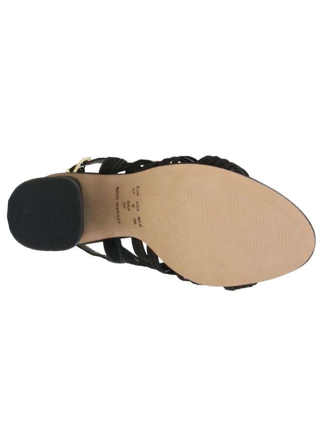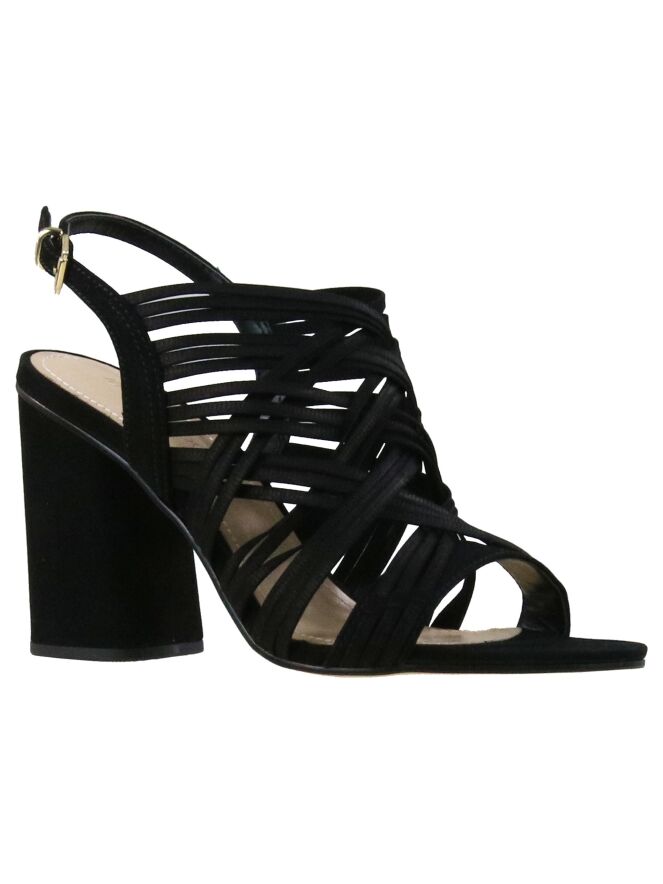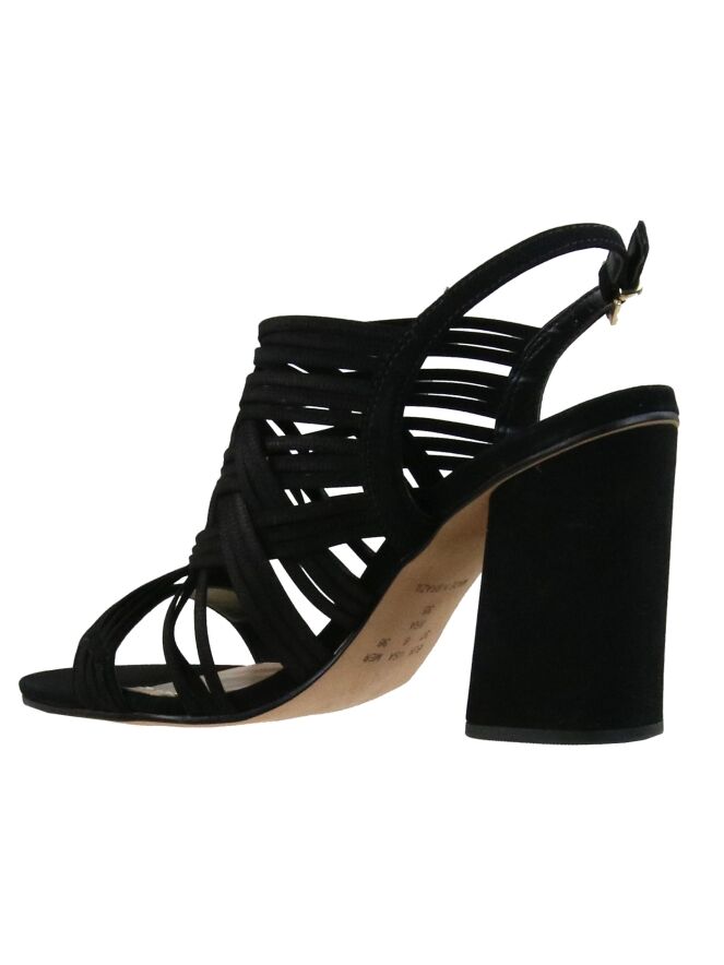 Een open sandaal van Vicenza in de kleur zwart. Over de voorvoet zijn meerdere diagonale biezen. Het hielbandje is verstelbaar. De elegante blokhak is bekleed in hetzelfde materiaal als de sandaal.