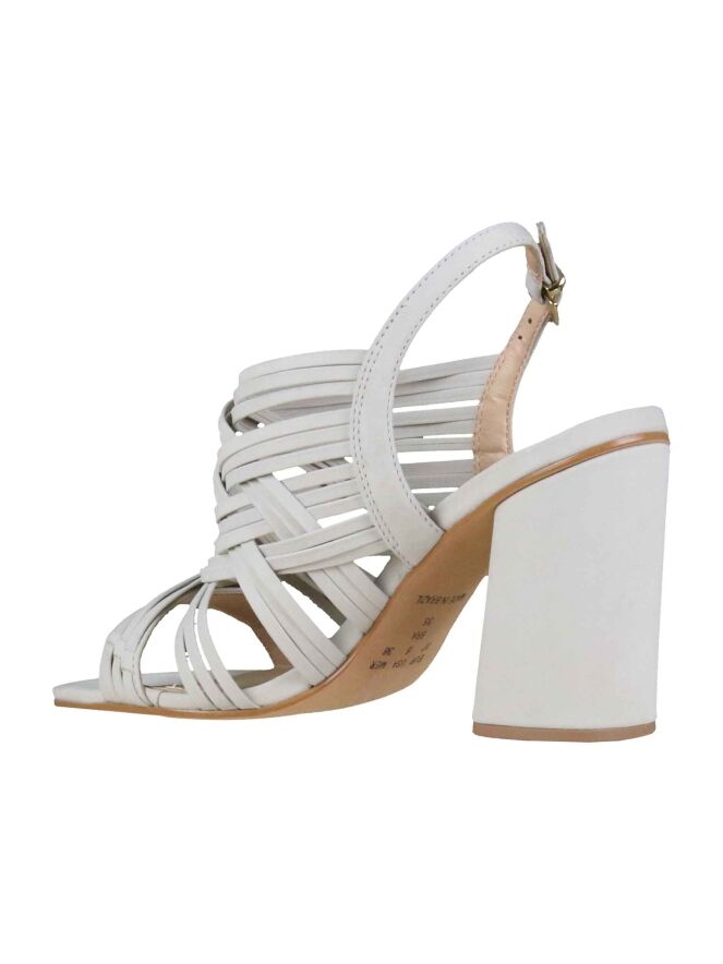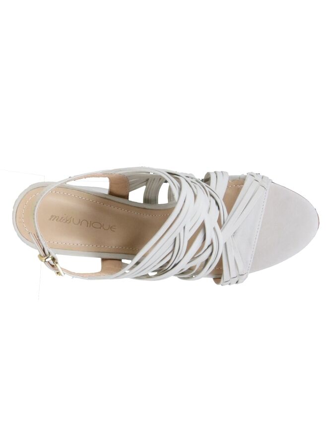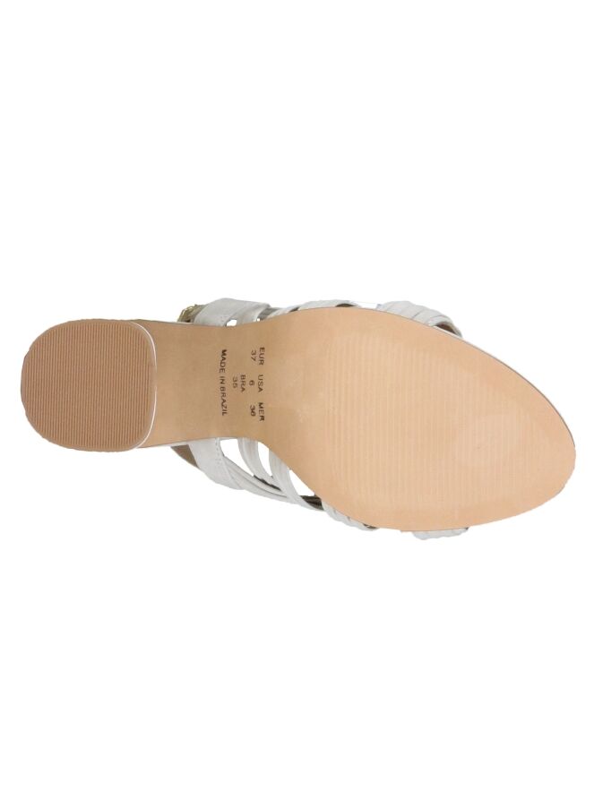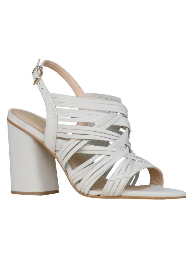 Een open sandaal van Vicenza in de kleur lichtgrijs. Over de voorvoet zijn meerdere diagonale biezen. Het hielbandje is verstelbaar. De elegante blokhak is bekleed in hetzelfde materiaal als de sandaal.