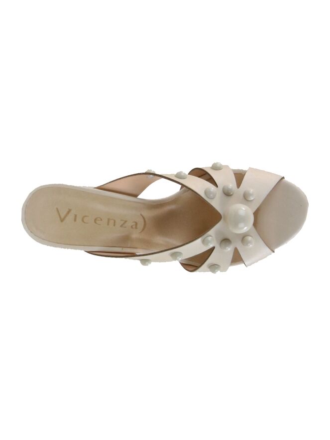 Een sandaal van Vicenza in de kleur beige. OP het leder zijn ronde beige kleurige studs met in het midden een ronde beige bol.