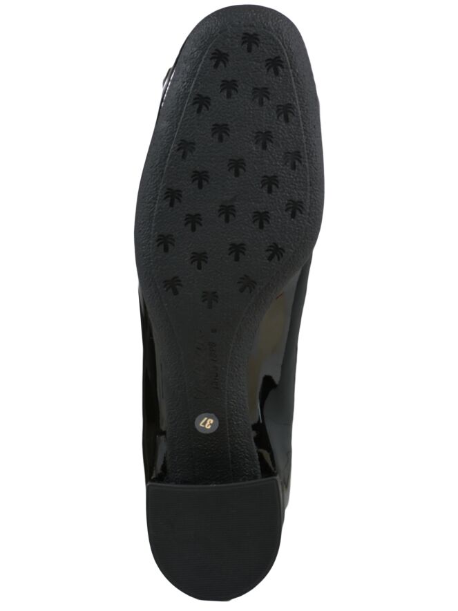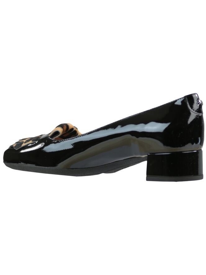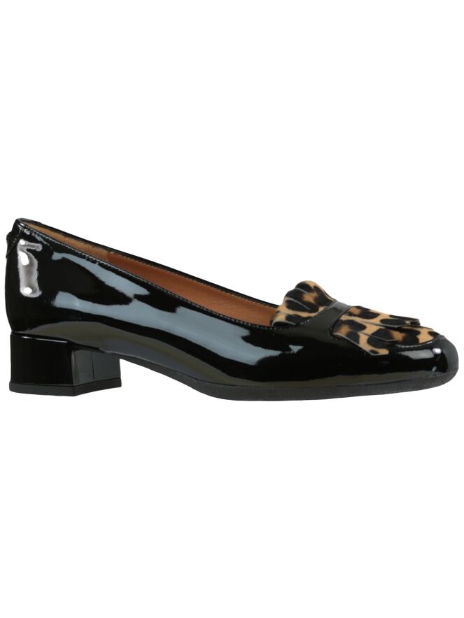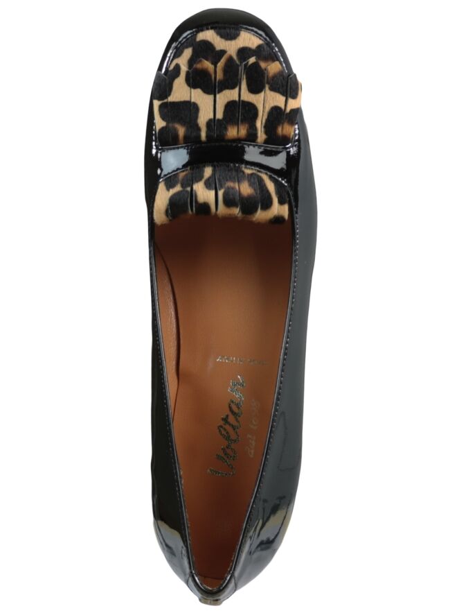 Een instapper van het merk Voltan in de kleur zwart. Over de voorvoet is een suède jamboree in een luipaard print met de kleuren cognac, camel en zwart waar over een zwart kleurige bies is. De instapper heeft een blokhak en de binnenkant van de instapper is met leder gevoerd. Bij deze schoen is een tas met artikelnummer: 404003353