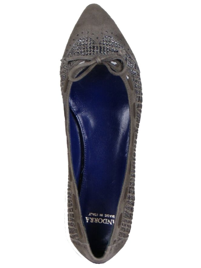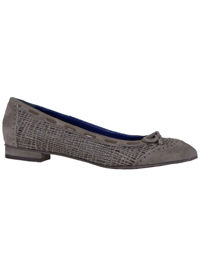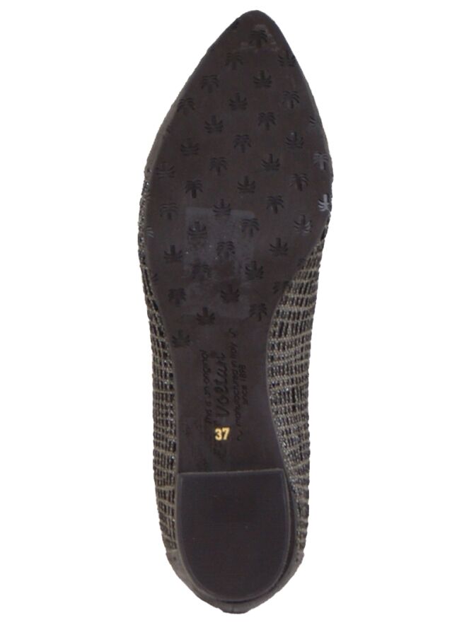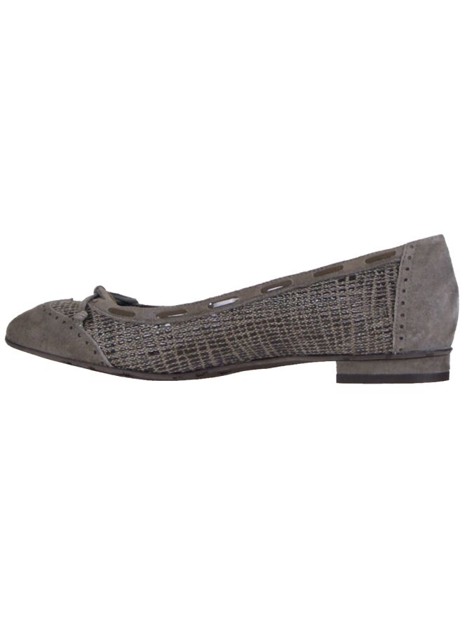 Een ballerina van Voltan in een taupe reliëf print en een spits neusje welke is bekleed in camoscio suède. Ook de hiel en het hakje zijn in effen suède bekleed. OP de voorvoet is een klein strikje bevestigd. De binnenvoering is van leder.