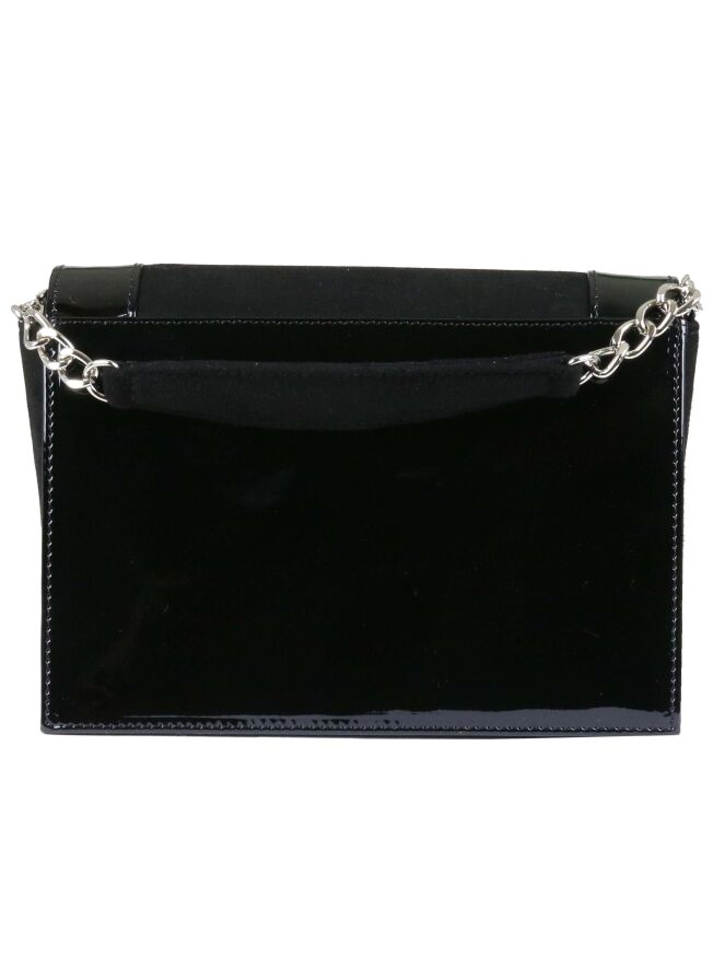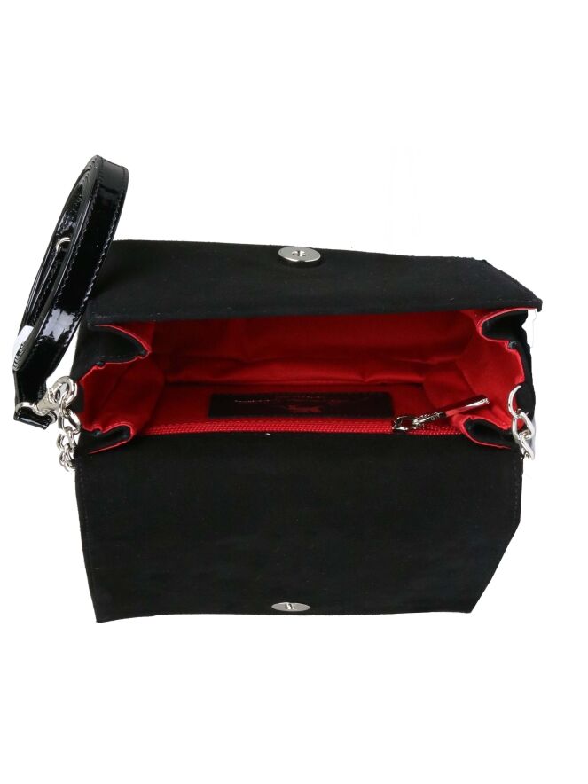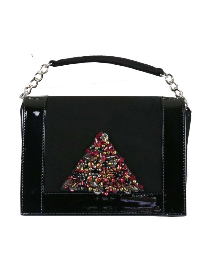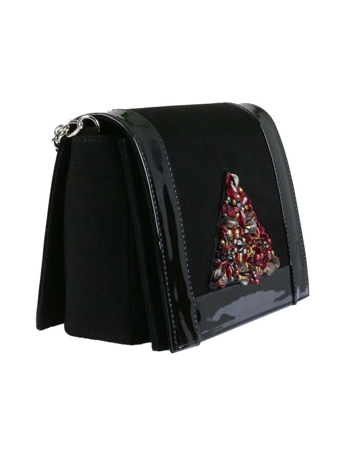 Een tasje van Voltan in de kleur zwart. De voorzijde is in een camoscio suède. De randen en de achterkant is in een zwart lakleder. Aan de voorzijde is een driehoek met strassteentjes en lovertjes met de kleuren robijnrood, brons en koper. Het tasje heeft een kort en een lang hengsel van een zilveren ketting.