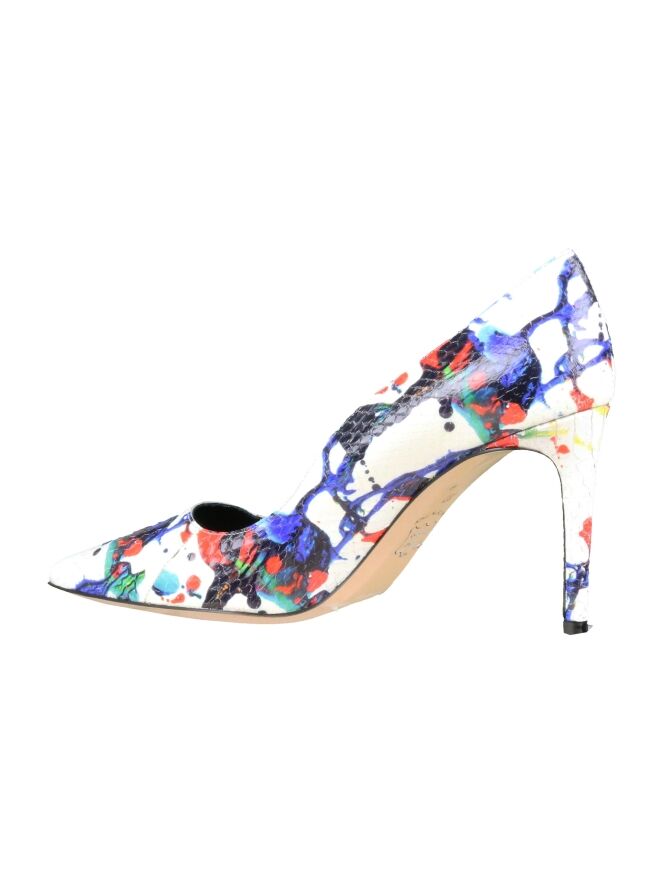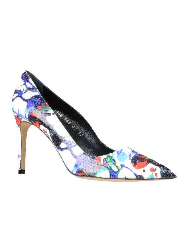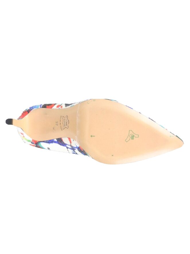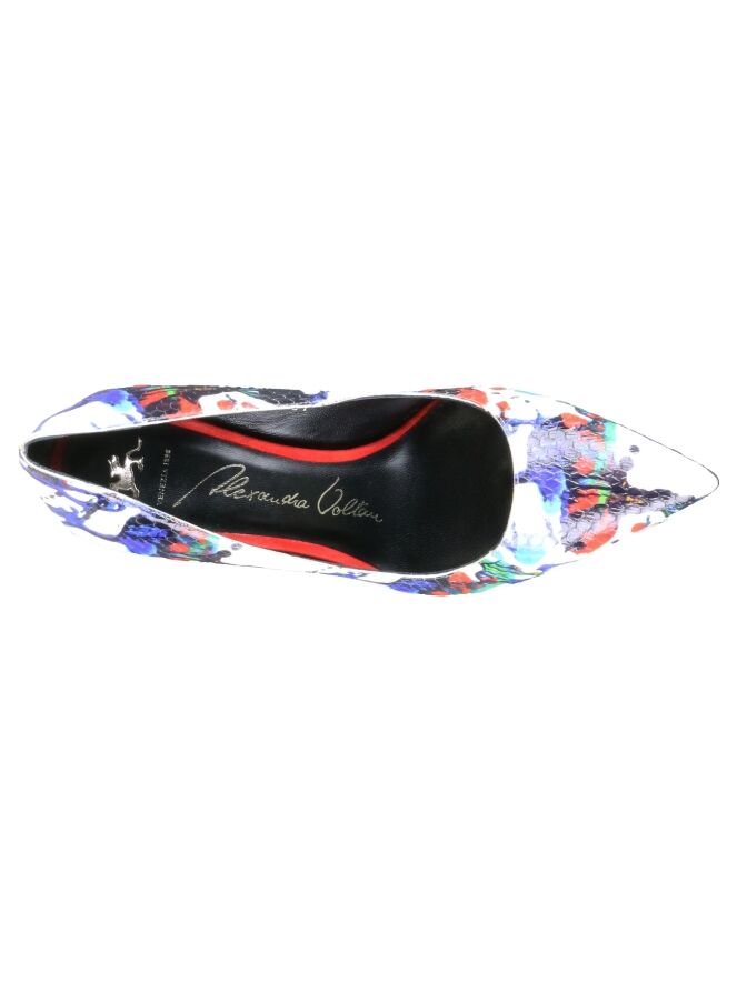 Een pump van Voltan in een print met de kleuren zwart, kobaltblauw, groen en rood op een roomwitte achtergrond. De neus is spits. De hak is in dezelfde print als de pump. Bij de pump is een tas in dezelfde kleurstelling met artikelnummer: 404000171