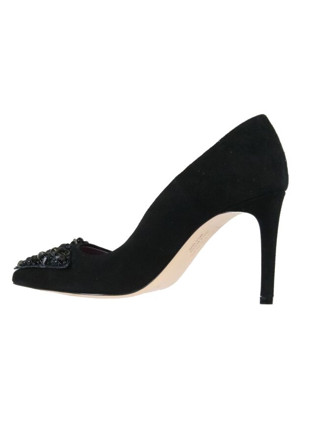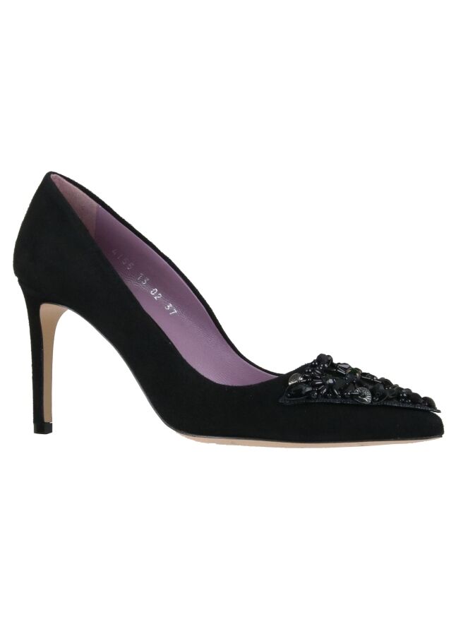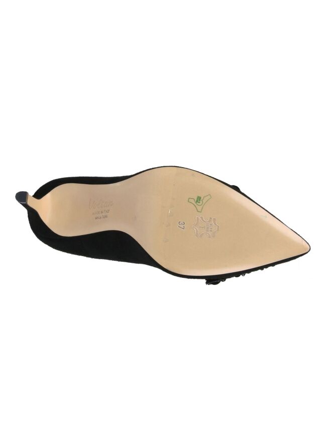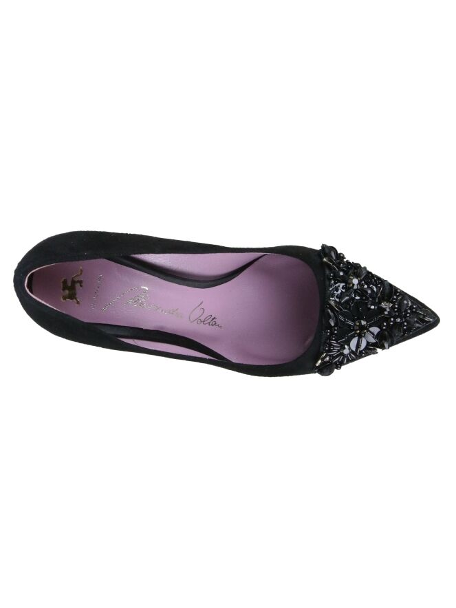 Een pump van Voltan in de kleur zwart. Over de voorvoet is een driehoekige decoratie van strassteentjes en lovertjes. De neus is spits en de binnenkant is gevoerd met leder.